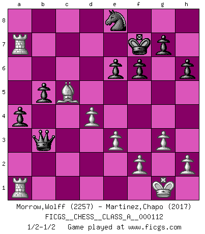 Last move : 1/2-1/2 2012 January 23 3:7:28 [Event "FICGS__CHESS__CLASS_A__000112"] [Site "FICGS"] [Date "2011.12.04"] [Round "1"] [White "Morrow,Wolff"] [Black "Martinez,Chapo"] [Result "1/2-1/2"] [WhiteElo "2257"] [BlackElo "2017"] 1.d4 Nf6 2.c4 e6 3.g3 d5 4.Nf3 dxc4 5.Bg2 a6 6.O-O Nc6 7.e3 Bd7 8.Qe2 b5 9.b3 cxb3 10.axb3 Be7 11.Bb2 O-O 12.Rc1 Nd5 13.Nc3 Ncb4 14.Ne4 f6 15.Nc5 Bxc5 16.Rxc5 a5 17.Ba3 c6 18.Qd2 Na6 19.R5c1 Ndb4 20.Ne1 Qb6 21.Nc2 Nxc2 22.Qxc2 Rfc8 23.Be4 h6 24.Bd6 Be8 25.Bg2 Qd8 26.Ba3 Nc7 27.Bxc6 Bxc6 28.Qxc6 Qd5 29.Bd6 Ne8 30.Qxc8 Rxc8 31.Rxc8 Kf7 32.Bc5 Qxb3 33.Ra8 a4 34.Ra7+ 1/2-1/2 Catalan Opening Kingside Castling by player White (move 6) Kingside Castling by player Black (move 11) This chess game ended in a draw. Follow this game move after move (download)Before the endgame, the Gods have placed the middle game. (Siegbert Tarrasch) Die Jungen erwarten, dass Opa einfach umfällt. Dann aber kann Opa fünf Stunden lang Schach spielen und die jungen Gegner an die Wand drücken. (Viktor Kortschnoi) Yo adoro todas la posiciones. Denme una partida posicional difícil, y la jugaré. Pero posiciones totalmente ganadas, no las tolero. (Hein Donner) Vous n'êtes pas toujours obligé de jouer le meilleur coup. Un coup doit être actif, entreprenant, correct et beau ! (David Bronstein) Plans are ideas that never come to fruition. (Daniel Parmet)