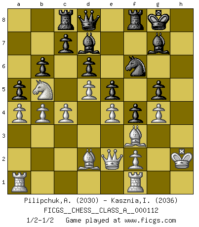 Last move : 1/2-1/2 2012 January 30 13:26:50 [Event "FICGS__CHESS__CLASS_A__000112"] [Site "FICGS"] [Date "2011.12.04"] [Round "1"] [White "Pilipchuk,Andrey"] [Black "Kasznia,Ireneusz"] [Result "1/2-1/2"] [WhiteElo "2030"] [BlackElo "2036"] 1.d4 Nf6 2.c4 g6 3.Nc3 Bg7 4.e4 d6 5.Nf3 O-O 6.h3 e5 7.d5 Nbd7 8.Be3 Nh5 9.g3 b6 10.Bg2 a5 11.O-O Nc5 12.b3 Bd7 13.Ne1 Qc8 14.Kh2 Qe8 15.Nd3 Nxd3 16.Qxd3 f5 17.Bd2 f4 18.Nb5 Rc8 19.Bf3 Nf6 20.a4 g5 21.g4 h5 22.Qe2 hxg4 23.hxg4 Qd8 24.b4 1/2-1/2 King's Indian : 5.Nf3 Kingside Castling by player Black (move 5) Kingside Castling by player White (move 11) This chess game ended in a draw. Follow this game move after move (download)I give 98 percent of my mental energy to Chess. Others give only 2 percent. (Bobby Fischer) Schach ist wie eine schöne Frau, zu der wir ständig zurückkehren, gleichviel, wie oft sie uns zurückweist. (Anonymous) La única cosa que los jugadores de Ajedrez tienen en común, es el Ajedrez. (Lodewijk Prins) Mais n'est-ce pas déjà le limiter injurieusement que d'appeler les échecs un jeu? N'est-ce pas aussi une science, un art, ou quelque chose qui, comme le cercueil de Mahomet entre ciel et terre, est suspendu entre l'un et l'autre, et qui réunit un nombre incroyable de contraires ? (Stefan Zweig) Hello Thibault, if I have had a plan (and I had one, I hope), I have forgotten it during the last week... - Hello Heinz-Georg. What do you mean a plan ? (Anonymous players, during a Big Chess game)