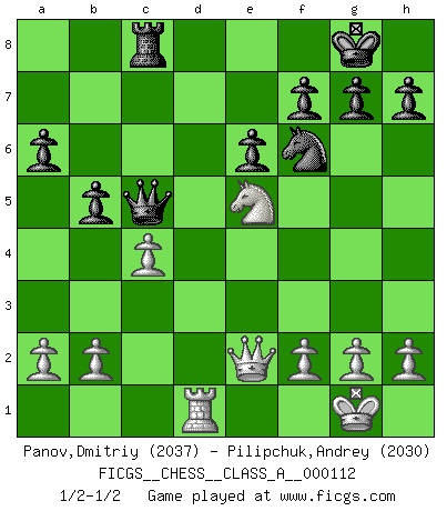 Last move : 1/2-1/2 2012 January 18 18:21:21 [Event "FICGS__CHESS__CLASS_A__000112"] [Site "FICGS"] [Date "2011.12.04"] [Round "1"] [White "Panov,Dmitriy"] [Black "Pilipchuk,Andrey"] [Result "1/2-1/2"] [WhiteElo "2037"] [BlackElo "2030"] 1.e4 c5 2.c3 d5 3.exd5 Qxd5 4.d4 Nf6 5.Nf3 Bg4 6.Be2 e6 7.O-O Nc6 8.Be3 cxd4 9.Nxd4 Bxe2 10.Qxe2 Be7 11.Nd2 O-O 12.Rfe1 Rfd8 13.Nxc6 Qxc6 14.Nf3 Rac8 15.Ne5 Qc7 16.Bd4 Bc5 17.Bxc5 Qxc5 18.Rad1 a6 19.c4 Rxd1 20.Rxd1 b5 1/2-1/2 Sicilian : Alapin's variation (2.c3) Kingside Castling by player White (move 7) Kingside Castling by player Black (move 11) This chess game ended in a draw. Follow this game move after move (download)There must have been a time when men were demigods, or they could not have invented Chess. (Gustav Schenk) Es genügt nicht ein guter Spieler zu sein, man muß auch gut spielen. (Siegbert Tarrasch) El Ajedrez, como cualquier actividad creativa, solo puede existir a través del esfuerzo combinado de aquellos que tienen talento creativo y de aquellos que poseen la habilidad de organizar su trabajo creativo. (Mikhail Botvinnik) Que feriez-vous si vous étiez en train de jouer aux échecs et que la fin du monde arrive ? Je continuerais à jouer. (Saint Borromée) He who laughs last probably does not get the joke. (Unknown)