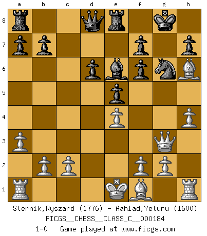 Last move : 1-0 2012 February 8 0:41:6 [Event "FICGS__CHESS__CLASS_C__000184"] [Site "FICGS"] [Date "2011.12.04"] [Round "1"] [White "Sternik,Ryszard"] [Black "Aahlad,Yeturu"] [Result "1-0"] [WhiteElo "1776"] [BlackElo "1600"] 1.e4 c5 2.Nf3 Nc6 3.d4 cxd4 4.Nxd4 e5 5.Nb5 Nf6 6.N1c3 Bb4 7.a3 Bxc3+ 8.Nxc3 O-O 9.Bg5 d6 10.Nd5 Be6 11.Nxf6+ gxf6 12.Bh6 Re8 13.Qd3 Ne7 14.Qg3+ Ng6 15.h4 1-0 Sicilian : Labourdonnais-Loewenthal variation Kingside Castling by player Black (move 8) Player White won this chess game. Follow this game move after move (download)There's never before been a Chess player with such a thorough knowledge of the intricacies of the game and such an absolutely indomitable will to win. I think Bobby is the greatest player that ever lived. (Lisa Lane) Ich bin stolz ein Bulgare zu sein. (Veselin Topalov) Cuando la partida de Ajedrez termina, el Peón y el Rey regresan a la misma caja. (Irish saying) L'ordinateur a tué l'originalité. Il n'y a plus guère d'aventures sur l'échiquier. (Jacob Murray) The ultimate in disposing one's troops is to be without ascertainable shape. Then the most penetrating spies cannot pry in nor can the wise lay plans against you. (Sun Tzu)