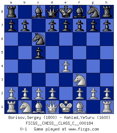 Last move : 0-1 2012 January 14 6:0:25 [Event "FICGS__CHESS__CLASS_C__000184"] [Site "FICGS"] [Date "2011.12.04"] [Round "1"] [White "Borisov,Sergey"] [Black "Aahlad,Yeturu"] [Result "0-1"] [WhiteElo "1800"] [BlackElo "1600"] 1.e4 c5 2.Nf3 Nc6 0-1 This chess game has been lost on time (started : 2011.12.04 12:22:21) Sicilian defense Player Black won this chess game. Follow this game move after move (download)No price is too great for the scalp of the enemy King. (Koblentz) Der Partner hat auch seine Existenzberechtigung. (Savielly Grigorievitsch Tartakower) El Ajedrez expande y enriquece tu mente. (Saudin Robovic) Avec des compensations pour le matériel en plus... (Anonyme) All battles are fought by scared men who'd rather be someplace else. (John Wayne in the movie In harm's way)
