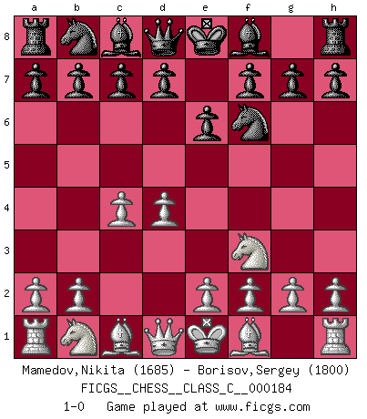 Last move : 1-0 2012 January 14 17:59:50 [Event "FICGS__CHESS__CLASS_C__000184"] [Site "FICGS"] [Date "2011.12.04"] [Round "1"] [White "Mamedov,Nikita"] [Black "Borisov,Sergey"] [Result "1-0"] [WhiteElo "1685"] [BlackElo "1800"] 1.d4 Nf6 2.c4 e6 3.Nf3 1-0 This chess game has been lost on time (started : 2011.12.04 12:22:21) Queen's pawn game Player White won this chess game. Follow this game move after move (download)Whoever sees no other aim in the game than that of giving checkmate to one's opponent will never become a good Chess player. (Euwe) Ein Springer auf f6 gegen die eigene Rochadestellung ist schlimmer als ein rostiger Nagel im Knie. (Efim Bogoljubov) Fischer sacrificó virtualmente todo lo que la mayoría de nosotros los 'debiles' (término que él usa) valoramos, respetamos y apreciamos por el amor de un astuto, a menudo hermoso tablero de juego, por el privilegio ambivalente de ser su mas grande maestro. (Paul Kollar) Que feriez-vous si vous étiez en train de jouer aux échecs et que la fin du monde arrive ? Je continuerais à jouer. (Saint Borromée) Depression is just anger without enthusiasm. (Unknown)