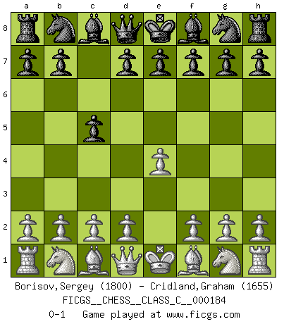 Last move : 0-1 2012 January 15 6:14:19 [Event "FICGS__CHESS__CLASS_C__000184"] [Site "FICGS"] [Date "2011.12.04"] [Round "1"] [White "Borisov,Sergey"] [Black "Cridland,Graham"] [Result "0-1"] [WhiteElo "1800"] [BlackElo "1655"] 1.e4 c5 0-1 This chess game has been lost on time (started : 2011.12.04 12:22:21) Sicilian defense Player Black won this chess game. Follow this game move after move (download)Chess, like any creative activity, can exist only through the combined efforts of those who have creative talent, and those who have the ability to organize their creative work. (Mikhail Botvinnik) Frage des Reporters: -Worin besteht das Ziel von Gambiteröffnungen? Antwort: -Auf Kosten der Partie einen Ruf als Angriffspieler zu erwerben.- (Siegbert Tarrasch) La captura del Rey enemigo es la finalidad pero no el primer objetivo de la partida. (William Steinitz) Karpov est une pièce de musée. (Garry Kasparov) You can't play chess if you're groggy from pills. (Anatoly Karpov)