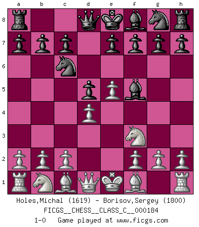 Last move : 1-0 2012 January 14 6:0:25 [Event "FICGS__CHESS__CLASS_C__000184"] [Site "FICGS"] [Date "2011.12.04"] [Round "1"] [White "Holes,Michal"] [Black "Borisov,Sergey"] [Result "1-0"] [WhiteElo "1619"] [BlackElo "1800"] 1.e4 Nc6 2.d4 d5 3.e5 Bf5 4.Nf3 1-0 This chess game has been lost on time (started : 2011.12.04 12:22:21) KP : Nimzovich defense Player White won this chess game. Follow this game move after move (download)Via the squares on the chessboard, the Indians explain the movement of time and the age, the higher influences which control the world and the ties which link Chess with the human soul. (Al-Masudi) Der zweitbeste Zug ist oft der einzig richtige. (Savielly Grigorievitsch Tartakower) Dejen al perfeccionista jugar por correo. (Yasser Seirawan) Les Echecs représentent une sphère d'idées créatrices basée sur la volonté des deux protagonistes. (Smyslov) The ego is not master in its own house. (Sigmund Freud)