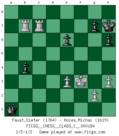 Last move : 1/2-1/2 2012 April 2 16:34:53 [Event "FICGS__CHESS__CLASS_C__000184"] [Site "FICGS"] [Date "2011.12.04"] [Round "1"] [White "Faust,Dieter"] [Black "Holes,Michal"] [Result "1/2-1/2"] [WhiteElo "1764"] [BlackElo "1619"] 1.d4 Nf6 2.Nf3 e6 3.Bg5 d5 4.e3 Be7 5.Nbd2 Nbd7 6.Bd3 c5 7.c4 O-O 8.O-O h6 9.Bh4 b6 10.Re1 Bb7 11.Rc1 Rc8 12.h3 a6 13.b3 Ne4 14.Bxe7 Qxe7 15.Rc2 Nxd2 16.Rxd2 dxc4 17.bxc4 Rfd8 18.Qe2 Bxf3 19.Qxf3 b5 20.Red1 cxd4 21.cxb5 Ne5 22.Qe4 Nxd3 23.Qxd3 dxe3 24.Qxd8+ Rxd8 25.Rxd8+ Kh7 26.fxe3 axb5 27.R8d7 Qa3 28.Rxf7 Qxa2 29.R1d7 Qa1+ 30.Kf2 b4 31.Rb7 Qc3 32.Rfc7 Qb2+ 33.Kf3 Qa1 1/2-1/2 Queen's pawn : Torre attack Kingside Castling by player Black (move 7) Kingside Castling by player White (move 8) This chess game ended in a draw. Follow this game move after move (download)Discovered check is the dive bomber of the Chessboard. (Reuben Fine) Man kann eine Schachpartie nur gewinnen, wenn das Gleichgewicht gestört ist. In einer Stellung mit ungestörtem Gleichgewicht ist auch das größte Genie hilflos - in der Stellung steckt dann eben kein genialer Einfall. (Wilhelm Steinitz) Realmente no sabemos como el juego fue inventado, aunque hay sospechas. Tan pronto como descubramos a los culpables, se los haremos saber. (Bruce Pandolfini) Lorsque vous vous retrouvez devant une position atroce, ne tendez pas un ultime piège dérisoire avec l'intention d'abandonner si l'adversaire le déjoue ! Faites-vous plutôt un devoir de résister comme si votre vie en dépendait. Jouez le coup qui vous déplairait au centuple si vous étiez dans la peau de votre tortionnaire ! There's always a bigger fish. (Qui-Gon Jinn in Star Wars ep.1)