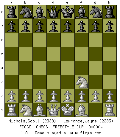 Last move : 1-0 2011 December 4 13:41:19 [Event "FICGS__CHESS__FREESTYLE_CUP__000004"] [Site "FICGS"] [Date "2011.12.04"] [Round "1"] [White "Nichols,Scott"] [Black "Lowrance,Wayne"] [Result "1-0"] [WhiteElo "2333"] [BlackElo "2335"] 1.Nf3 1-0 Reti Opening Player White won this chess game. Follow this game move after move (download)First-class players lose to second-class players because second-class players sometimes play a first-class game. (Siegbert Tarrasch) Jede Eröffnung ist gut genug um gespielt zu werden, wenn nur ihr Ruf schlecht genug ist. (Savielly Grigorievitsch Tartakower) El Ajedrez es sobre todo, ¡una pelea!. (Emanuel Lasker) Je ne suis pas le dernier à jouer lâchement des coups douteux pendant le zeïtnot de l'adversaire pour l'achever: en effet les coups qui font le plus peur sont ceux que l'on ne comprend pas. Je me fais souvent peur quand je joue. (Un professeur anonyme) Horse racing is animated roulette. (Roger Kahn)