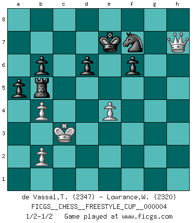 Last move : 1/2-1/2 2011 December 4 16:0:28 [Event "FICGS__CHESS__FREESTYLE_CUP__000004"] [Site "FICGS"] [Date "2011.12.04"] [Round "1"] [White "de Vassal,Thibault"] [Black "Lowrance,Wayne"] [Result "1/2-1/2"] [WhiteElo "2347"] [BlackElo "2320"] 1.e4 c5 2.Nf3 d6 3.d4 cxd4 4.Nxd4 Nf6 5.Nc3 a6 6.f3 e5 7.Nb3 Be6 8.Be3 Nbd7 9.a4 Be7 10.Qd2 Qc7 11.g4 Nb6 12.g5 Nfd7 13.h4 Rc8 14.h5 Nc4 15.Bxc4 Qxc4 16.a5 Qc6 17.O-O-O Bxb3 18.cxb3 Qb5 19.Kc2 Qxa5 20.Kb1 Rc6 21.f4 exf4 22.Bxf4 f6 23.g6 hxg6 24.hxg6 Rxh1 25.Rxh1 Nf8 26.Rh7 Nxg6 27.Rxg7 Nxf4 28.Rxe7+ Kxe7 29.Nd5+ Nxd5 30.Qxa5 Rc5 31.Qe1 Nb6 32.b4 Rb5 33.Kc2 Nd7 34.Kc3 Ne5 35.Qg3 Nf7 36.Qg7 b6 37.Qh7 a5 1/2-1/2 Sicilian : Najdorf Queenside Castling by player White (move 17) This chess game ended in a draw. Follow this game move after move (download)For surely of all the drugs in the world, Chess must be the most permanently pleasurable. (Assiac) Schach wird sich dank seiner hohen kulturellen Tradition immer durchsetzen. In näherer Zukunft womöglich sogar als Gegenreaktion auf die maßlose Reizüberflutung im Freizeit- und Spielbereich. (Garry Kasparov) El Ajedrez es tortura mental. (Garry Kasparov) La conception d'un plan est le processus par lequel un joueur exploite les avantages de sa position tout en s'efforçant d'en réduire au minimum les inconvénients. Afin de garantir le succès, un plan doit toujours se fonder sur un diagnostic objectif des particularités d'une position. La conception d'un plan est d'autant plus difficile que la position est équilibrée, et grandement facilitée lorsqu'il n'existe qu'un seul plan susceptible de répondre aux exigences de la position. (Harry Golombek) Without deviation from the norm, progress is not possible. (Frank Zappa)
