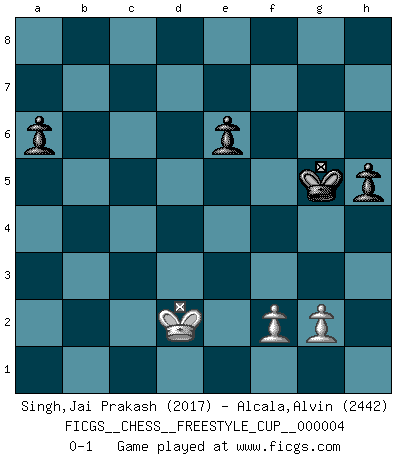 Last move : 0-1 2011 December 4 18:15:47 [Event "FICGS__CHESS__FREESTYLE_CUP__000004"] [Site "FICGS"] [Date "2011.12.04"] [Round "1"] [White "Singh,Jai Prakash"] [Black "Alcala,Alvin"] [Result "0-1"] [WhiteElo "2017"] [BlackElo "2442"] 1.e4 c5 2.Nf3 d6 3.Bb5+ Bd7 4.Bxd7+ Qxd7 5.O-O Nc6 6.c3 Nf6 7.d4 Nxe4 8.d5 Nb8 9.Qd3 Nf6 10.Bg5 Na6 11.c4 h6 12.Bd2 g6 13.Nc3 Bg7 14.a3 O-O 15.Rfe1 Rfe8 16.Rad1 Nc7 17.b4 cxb4 18.axb4 a6 19.Nd4 b5 20.Rc1 bxc4 21.Qxc4 Rac8 22.Nc6 e6 23.dxe6 Nxe6 24.Nd5 Nxd5 25.Qxd5 Kh7 26.Red1 Qb7 27.Qf3 Rc7 28.h4 h5 29.Be3 Rec8 30.Nd4 Rxc1 31.Bxc1 Qxb4 32.Nxe6 fxe6 33.Bg5 d5 34.Qf7 Rc6 35.Qd7 Qd6 36.Qxd6 Rxd6 37.Rc1 d4 38.Kf1 d3 39.Bd2 Rb6 40.Ke1 Rb2 41.Bg5 d2+ 42.Bxd2 Rxd2 43.Kxd2 Bh6+ 44.Kd1 Bxc1 45.Kxc1 g5 46.hxg5 Kg6 47.Kd2 Kxg5 0-1 Sicilian : Canal-Sokolsky attack, Bronstein gambit Kingside Castling by player White (move 5) Kingside Castling by player Black (move 14) 10 pieces endgame at move 44 : White KPPP , Black KBPPPP WHITE : King + 3 Pawns BLACK : King + 1 Bishop 4 Pawns 9 pieces endgame at move 45 : White KPPP , Black KPPPP WHITE : King + 3 Pawns BLACK : King + 4 Pawns 8 pieces endgame at move 46 : White KPPP , Black KPPP WHITE : King + 3 Pawns BLACK : King + 3 Pawns 7 pieces endgame at move 47 : White KPP , Black KPPP WHITE : King + 2 Pawns BLACK : King + 3 Pawns Player Black won this chess game. Follow this game move after move (download)For me, Chess is life and every game is like a new life. Every Chess player gets to live many lives in one lifetime. (Eduard Gufeld) Das Blackmar-Diemer-Gambit verändert den ganzen Menschen! (Emil Joseph Diemer) Yo siempre he tenido un ligero sentimiento de lástima por una persona que no tiene conocimiento del Ajedrez. (Siegbert Tarrasch) Aux échecs, les retours au sommet sont rares : les dommages psychologiques consécutifs à une défaite sont trop sévères. (Daily Telegraph) Memory is a crazy woman that hoards colored rags and throws away food. (Austin O'Malley)