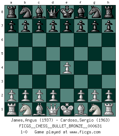Last move : 1-0 2011 December 4 22:7:10 [Event "FICGS__CHESS__BULLET_BRONZE__000631"] [Site "FICGS"] [Date "2011.12.04"] [Round "1"] [White "James,Angus"] [Black "Cardoso,Sergio"] [Result "1-0"] [WhiteElo "1937"] [BlackElo "1963"] 1.e4 1-0 This chess game has been lost on time (started : 2011.12.04 21:44:19) King's pawn Opening Player White won this chess game. Follow this game move after move (download)When you play Bobby, it is not a question if you win or lose. It is a question if you survive. (Boris Spassky) Wenn Capablanka heute auf der Schachbühne erscheinen würde, hätte er ein halbes Jahr gebraucht um sich die Schachtheorie anzueignen. Und dann hätte er alles und jeden besiegt. (Mikhail Moiseyevich Botvinik) En el Ajedrez, cuando menos, el valiente hereda la tierra. (Edmar Mednis) Un footballeur joue avec ses pieds, parfois avec sa tête. Un joueur d'échecs ne joue qu'avec sa tête. Et quand il ne joue plus, il meurt. (Jacob Murray) Do you know these so called Volunteers don't even get paid! (Simpsons)