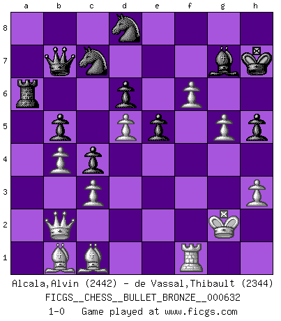 Last move : 1-0 2011 December 5 18:11:51 [Event "FICGS__CHESS__BULLET_BRONZE__000632"] [Site "FICGS"] [Date "2011.12.05"] [Round "1"] [White "Alcala,Alvin"] [Black "de Vassal,Thibault"] [Result "1-0"] [WhiteElo "2442"] [BlackElo "2344"] 1.e4 c5 2.Nf3 Nc6 3.Bb5 d6 4.O-O Bd7 5.Re1 Nf6 6.c3 a6 7.Ba4 b5 8.Bc2 e5 9.h3 Be7 10.d4 O-O 11.d5 Na5 12.b3 Qc7 13.Be3 Nb7 14.Nbd2 Rfc8 15.Qe2 h6 16.Reb1 Bf8 17.Nf1 c4 18.b4 a5 19.a3 g6 20.Qd2 Kh7 21.Re1 Bg7 22.Rac1 axb4 23.axb4 Ra2 24.Ng3 Qd8 25.Ra1 Rca8 26.Rxa2 Rxa2 27.Qc1 Qa8 28.Bb1 Ra1 29.Qd2 Qa3 30.Ne2 Qa4 31.g4 h5 32.g5 Ne8 33.Kg2 Qa8 34.Qb2 Nd8 35.Bc1 Ra6 36.Nh4 f6 37.f4 fxg5 38.fxg5 Qc8 39.Rh1 Nc7 40.Ng3 Be8 41.Rf1 Bd7 42.Ngf5 gxf5 43.Nxf5 Bxf5 44.exf5 Qb7 45.f6 1-0 Sicilian : Nimzovich-Rossolimo attack (without ...d6) Kingside Castling by player White (move 4) Kingside Castling by player Black (move 10) Player White won this chess game. Follow this game move after move (download)Chess is so inspiring that I do not believe a good player is capable of having an evil thought during the game. (Wilhelm Steinitz) Die größte Kunst beim Schach besteht darin dem Gegner nicht zu zeigen was er tun kann. (Garry Kasparov) Nada excita más a Grandes Maestros aburridos que una novedad teórica. (Dominic Lawson) Il vaut toujours mieux jouer un plan faux de façon logique que de n'avoir pas de plan du tout. (Victor Kortchnoï) Macintosh - we might not get everything right, but at least we knew the century was going to end. (Douglas Adams)