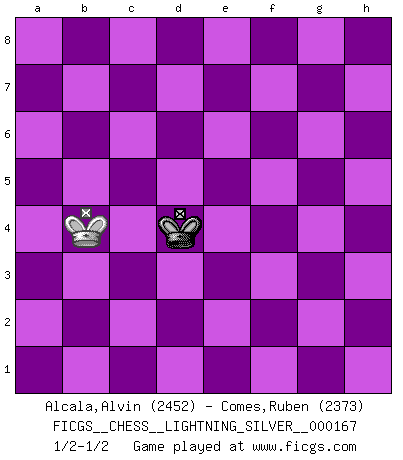 Last move : 1/2-1/2 2011 December 6 3:9:16 [Event "FICGS__CHESS__LIGHTNING_SILVER__000167"] [Site "FICGS"] [Date "2011.12.06"] [Round "1"] [White "Alcala,Alvin"] [Black "Comes,Ruben"] [Result "1/2-1/2"] [WhiteElo "2452"] [BlackElo "2373"] 1.e4 c5 2.Nf3 d6 3.d4 cxd4 4.Nxd4 Nf6 5.Nc3 a6 6.f3 e5 7.Nb3 Be6 8.Be3 Be7 9.Qd2 O-O 10.O-O-O Nbd7 11.a3 b5 12.g4 Nc5 13.Nxc5 dxc5 14.Nd5 Bxd5 15.exd5 Qd6 16.g5 Nh5 17.h4 b4 18.a4 b3 19.cxb3 Ng3 20.Bc4 Nxh1 21.Rxh1 f5 22.Re1 Rf7 23.f4 e4 24.Qc3 g6 25.h5 gxh5 26.Rh1 Bf8 27.Rxh5 Bg7 28.Qd2 Rb7 29.Qf2 Rc8 30.Kb1 Kh8 31.Qf1 Rcb8 32.Qh3 Qg6 33.Bxc5 e3 34.Bxe3 Rxb3 35.Bxb3 Rxb3 36.Rh6 Qf7 37.Rb6 Rxb6 38.Bxb6 Qxd5 39.Qe3 Kg8 40.Qe8+ Bf8 41.Be3 Kg7 42.Bc1 Bc5 43.b3 Bd4 44.Kc2 Qc5+ 45.Kd1 Qd5 46.Ke2 Qg2+ 47.Kd3 Qd5 48.Qe7+ Kg6 49.Qe2 h6 50.gxh6 Kxh6 51.Kc2 Qc6+ 52.Kb1 Qe4+ 53.Qxe4 fxe4 54.Bb2 Bxb2 55.Kxb2 Kg6 56.Kc3 Kf5 57.b4 Kxf4 58.Kd2 Ke5 59.a5 Kd5 60.Ke3 Kc4 61.b5 Kxb5 62.Kxe4 Kxa5 63.Kd3 Kb4 64.Kc2 Kc4 65.Kb2 a5 66.Ka3 a4 67.Kxa4 Kc3 68.Ka3 Kc4 69.Ka4 Kc3 70.Ka3 Kd3 71.Kb3 Kd4 72.Kb4 Kd5 73.Kb5 Kd4 74.Kb4 Kd5 75.Kb5 Kd4 76.Kb4 1/2-1/2 Don Groves Why all those meaningless King moves? Sicilian : Najdorf Kingside Castling by player Black (move 9) Queenside Castling by player White (move 10) 10 pieces endgame at move 53 : White KQBPPP , Black KBPP WHITE : King + 1 Queen 1 Bishop 3 Pawns BLACK : King + 1 Bishop 2 Pawns 9 pieces endgame at move 53 : White KBPPP , Black KBPP WHITE : King + 1 Bishop 3 Pawns BLACK : King + 1 Bishop 2 Pawns 8 pieces endgame at move 54 : White KPPP , Black KBPP WHITE : King + 3 Pawns BLACK : King + 1 Bishop 2 Pawns 7 pieces endgame at move 55 : White KPPP , Black KPP WHITE : King + 3 Pawns BLACK : King + 2 Pawns 6 pieces endgame at move 57 : White KPP , Black KPP WHITE : King + 2 Pawns BLACK : King + 2 Pawns 5 pieces endgame at move 61 : White KP , Black KPP WHITE : King + 1 Pawn BLACK : King + 2 Pawns 4 pieces endgame at move 62 : White KP , Black KP WHITE : King + 1 Pawn BLACK : King + 1 Pawn 3 pieces endgame at move 62 : White K , Black KP WHITE : King + BLACK : King + 1 Pawn 2 pieces endgame at move 67 : White K , Black K WHITE : King + BLACK : King + This chess game ended in a draw. Follow this game move after move (download)I believe that Chess possesses a magic that is also a help in advanced age. A rheumatic knee is forgotten during a game of Chess and other events can seem quite unimportant in comparison with a catastrophe on the chessboard. (Vlastimil Hort) Sie bekommen vielleicht den Eindruck, dass die Spitzenspieler überhaupt gar nicht so stark sind. Aber das stimmt nicht. Es ist eine Illusion. Mit einem Computer an der Seite ist es sehr leicht, Urteile zu fällen, aber wenn man alleine am Brett sitzt, sieht die Sache ganz anders aus. (Vladimir Kramnik) Solo existe una cosa que Fischer hace en el Ajedrez sin placer: ¡perder!. (Boris Spassky) 'L'échange des dames est un coup dur pour les deux adversaires...' Un journaliste lors d'une partie du match Spassky-Fischer Dave, my mind is going. I can feel it. (HAL 9000 in 2001, a space odyssey)