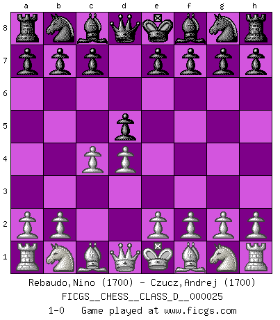Last move : 1-0 2007 February 19 5:6:55 [Event "FICGS__CHESS__CLASS_D__000025"] [Site "FICGS"] [Date "2007.01.09"] [Round "1"] [White "Rebaudo,Nino"] [Black "Czucz,Andrej"] [Result "1-0"] [WhiteElo "1700"] [BlackElo "1700"] 1.d4 d5 2.c4 1-0 This chess game has been lost on time (started : 2007.01.09 13:23:42) Queen's Gambit Player White won this chess game. Follow this game move after move (download)It is not enough to be a good player... you must also play well. (Siegbert Tarrasch) Ich trinke, ich rauche, ich spiele, ich liebe Frauen aber Fernschach ist ein Laster, das ich nicht habe. (Mikhail Nekhemyevich Tal) ¿Quién es tu oponente esta tarde? Esta tarde mi oponente son las piezas negras. (Akiba Rubinstein) Aux échecs, les retours au sommet sont rares : les dommages psychologiques consécutifs à une défaite sont trop sévères. (Daily Telegraph) If we knew what we were doing, we would not call it research. (Albert Einstein)