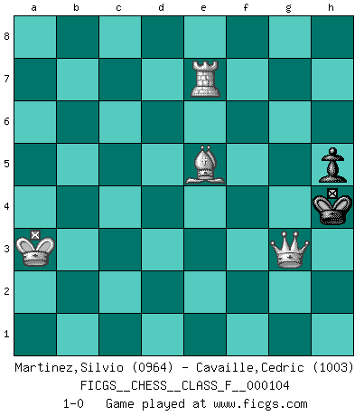 Last move : 1-0 2012 February 29 2:20:53 [Event "FICGS__CHESS__CLASS_F__000104"] [Site "FICGS"] [Date "2011.12.06"] [Round "1"] [White "Martinez,Silvio"] [Black "Cavaille,Cedric"] [Result "1-0"] [WhiteElo "0964"] [BlackElo "1003"] 1.e4 c5 2.Na3 d6 3.Nf3 Nf6 4.Bc4 e6 5.O-O Be7 6.c3 O-O 7.d4 cxd4 8.Qxd4 Qb6 9.Qxb6 axb6 10.b4 d5 11.exd5 Nxd5 12.Bb2 Nc6 13.b5 Na5 14.Rfe1 Nxc4 15.Nxc4 Bd7 16.Nfe5 Bxb5 17.Re4 Bxc4 18.Rxc4 Rac8 19.Rxc8 Rxc8 20.c4 Rc5 21.cxd5 Rxd5 22.h3 Bf6 23.f4 Bxe5 24.fxe5 f6 25.exf6 Rd2 26.Bc3 Rd3 27.Bb2 gxf6 28.Bxf6 h5 29.Rb1 Rd6 30.a4 Kf7 31.Rf1 Kg6 32.Be5 Rd5 33.Bc7 Ra5 34.Ra1 Ra6 35.Kf2 b5 36.a5 b4 37.Rb1 Rc6 38.Bb6 Rc4 39.Kf3 Kf5 40.Ke3 Ke5 41.Kd3 Kd5 42.Bd8 Rc3+ 43.Kd2 Kc4 44.Bf6 Rd3+ 45.Kc2 Rg3 46.Rg1 b3+ 47.Kb2 Kb5 48.Bd8 Kc6 49.Ka3 Kb5 50.Bc7 Kc4 51.Bxg3 Kc3 52.Be5+ Kc2 53.Rf1 b2 54.Bxb2 Kd2 55.Rf7 e5 56.Bxe5 Kd3 57.Rxb7 Ke4 58.Re7 Ke3 59.a6 Kf2 60.a7 Kxg2 61.a8Q Kxh3 62.Qf3+ Kh4 63.Qg3 1-0 Sicilian defense Kingside Castling by player White (move 5) Kingside Castling by player Black (move 6) 10 pieces endgame at move 54 : White KRBPPP , Black KPPP WHITE : King + 1 Rook 1 Bishop 3 Pawns BLACK : King + 3 Pawns 9 pieces endgame at move 56 : White KRBPPP , Black KPP WHITE : King + 1 Rook 1 Bishop 3 Pawns BLACK : King + 2 Pawns 8 pieces endgame at move 57 : White KRBPPP , Black KP WHITE : King + 1 Rook 1 Bishop 3 Pawns BLACK : King + 1 Pawn 7 pieces endgame at move 60 : White KRBPP , Black KP WHITE : King + 1 Rook 1 Bishop 2 Pawns BLACK : King + 1 Pawn Promotion Queen by player White (move 61) 6 pieces endgame at move 61 : White KQRB , Black KP WHITE : King + 1 Queen 1 Rook 1 Bishop BLACK : King + 1 Pawn Player White won this chess game. Follow this game move after move (download)We like to think. (Gary Kasparov) Wer wird heute Abend ihr Gegner sein? -- Heute Abend spiele ich gegen die schwarzen Steine. (Akiba Rubinstein) El Ajedrez es tortura mental. (Garry Kasparov) C'est une question de caractère, Beaucoup de gens perdent leur motivation très vite. D'autres, ils sont rares, peuvent la conserver très longtemps. J'aime les échecs, encore aujourd'hui je suis heureux d'analyser des parties. J'aime toujours gagner, je déteste encore perdre. Bien jouer est important pour mon intégrité intellectuelle et morale. Et puis les échecs vivent en ce moment une période historique grâce à Internet. Ils se développent dans les systèmes éducatifs à travers le monde. Ils sortent de leur ghetto, et c'est mon rôle de mener à bien cette révolution. (Gary Kasparov) Man with more than one clock never knows what time it is. (Chinese thought)