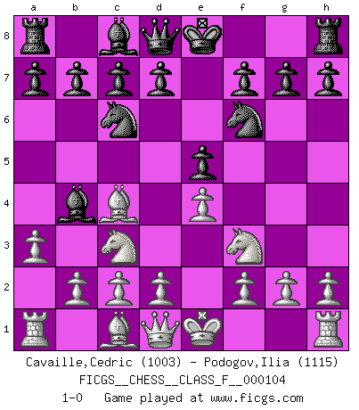 Last move : 1-0 2012 January 18 18:26:41 [Event "FICGS__CHESS__CLASS_F__000104"] [Site "FICGS"] [Date "2011.12.06"] [Round "1"] [White "Cavaille,Cedric"] [Black "Podogov,Ilia"] [Result "1-0"] [WhiteElo "1003"] [BlackElo "1115"] 1.e4 e5 2.Nf3 Nc6 3.Bc4 Nf6 4.Nc3 Bb4 5.a3 1-0 This chess game has been lost on time (started : 2011.12.06 19:20:35) Two knights defense Player White won this chess game. Follow this game move after move (download)Openings teach you openings. Endgames teach you chess ! (Stephan Gerzadowicz) Ein Großmeister muß tausende Partien in seinem Kopf speichern, denn diese sind für Ihn, was die Worte der Muttersprache für gewöhnliche Leute sind, oder Noten für Musiker... (Garry Kasparov) Aún el Rey más flojo huye despavorido ante la amenaza de un Jaque doble. (Aaron Nimzowitsch) Fischer est le meilleur joueur du monde et Karpov n'est qu'un joueur de bistrot. (Garry Kasparov, agé de 16 ans) Nowadays, anyone who cannot speak English and is incapable of using the Internet is regarded as backward. (Al-Waleed bin Talal)