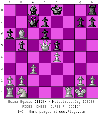 Last move : 1-0 2012 January 8 21:17:26 [Event "FICGS__CHESS__CLASS_F__000104"] [Site "FICGS"] [Date "2011.12.06"] [Round "1"] [White "Belaz,Egidio"] [Black "Melquiades,Jay"] [Result "1-0"] [WhiteElo "1175"] [BlackElo "0909"] 1.e4 e5 2.f4 exf4 3.Nf3 f6 4.d4 Nc6 5.Bxf4 Bd6 6.Be3 Nge7 7.Bc4 a6 8.O-O Bb4 9.c3 Ba5 10.d5 Ne5 11.Nxe5 fxe5 12.d6 cxd6 13.Bf7+ Kf8 14.Qb3 b5 15.Bd5 Ke8 16.Bxa8 Qc7 17.Bd5 Nxd5 18.Qxd5 Bb6 19.Bxb6 1-0 King's knight's gambit Kingside Castling by player White (move 8) Player White won this chess game. Follow this game move after move (download)Not all artists are Chess players, but all Chess players are artists. (Marcel Duchamp) Ich möchte Schüler heranbilden, die das Vermögen haben, selbst zu denken und Kritik zu üben. (Emanuel Lasker) Ciertamente, de todas la drogas del mundo, el Ajedrez debe ser el mas placentero permamentemente. (Assiac) Roi des jeux et jeu des rois, les échecs portent en eux un sentiment d'infini. Ils donnent à celui qui s'est efforcé d'en approfondir les arcanes l'impression de n'être pas à la mesure de l'homme; en fait, ils constituent un résumé de l'univers, un microcosme, et figurent cette grande échelle qui, dans les plans de la lumière descend jusqu'à la matière, qui des abîmes insondables remonte jusqu'en l'infini de Dieu. (Pyrame) We cannot be sure of having something to live for unless we are willing to die for it. (Ernesto Che Guevara)