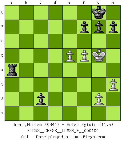 Last move : 0-1 2012 February 4 1:41:47 [Event "FICGS__CHESS__CLASS_F__000104"] [Site "FICGS"] [Date "2011.12.06"] [Round "1"] [White "Jerez,Miriam"] [Black "Belaz,Egidio"] [Result "0-1"] [WhiteElo "0844"] [BlackElo "1175"] 1.e4 c5 2.Na3 Nc6 3.Nf3 e5 4.Bc4 Nf6 5.O-O Nxe4 6.Re1 d5 7.Bb5 Bd7 8.Bxc6 Bxc6 9.Nxe5 Bd6 10.Nxc6 bxc6 11.d3 O-O 12.dxe4 d4 13.Nc4 Bc7 14.a3 a5 15.h3 Qb8 16.b3 a4 17.bxa4 Rxa4 18.c3 Rxc4 19.Qe2 Rxc3 20.Bd2 Rb3 21.a4 d3 22.Qg4 Be5 23.Rac1 Bd4 24.Be3 Bxe3 25.Rxe3 d2 26.Rd1 Rb1 27.e5 Rxd1+ 28.Qxd1 Rd8 29.Rc3 Qb2 30.Rxc5 Qb6 31.Rc2 Qb3 32.Rxd2 Qxd1+ 33.Rxd1 Rxd1+ 34.Kh2 Ra1 35.f4 Rxa4 36.Kg3 c5 37.Kg4 c4 38.Kg5 c3 39.f5 c2 0-1 Sicilian defense Kingside Castling by player White (move 5) Kingside Castling by player Black (move 11) Player Black won this chess game. Follow this game move after move (download)If I win a tournament, I win it by myself. I do the playing. Nobody helps me. (Bobby Fischer) Es hat in meinem Leben Zeiten gegeben, da ich sehr nahe daran war zu glauben, daß ich auch nicht eine einzige Schachpartie verlieren könnte. (José Raúl Capablanca) Aún deseo matar a Fischer. (Boris Spassky) Tout change constamment, y compris dans le monde des Echecs. (Botvinnik) Strategy without tactics is the slowest route to victory. Tactics without strategy is the noise before defeat. (Sun Tzu)