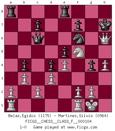 Last move : 1-0 2012 January 15 21:17:43 [Event "FICGS__CHESS__CLASS_F__000104"] [Site "FICGS"] [Date "2011.12.06"] [Round "1"] [White "Belaz,Egidio"] [Black "Martinez,Silvio"] [Result "1-0"] [WhiteElo "1175"] [BlackElo "0964"] 1.e4 Nc6 2.Nf3 e5 3.Bc4 Nf6 4.Nc3 Bc5 5.Ng5 d5 6.Bd3 O-O 7.O-O d4 8.Na4 Bd6 9.b3 h6 10.Nf3 a6 11.Nb2 Re8 12.Nc4 b5 13.Nxd6 Qxd6 14.Bb2 Nb4 15.Ba3 a5 16.Bxb5 Bd7 17.Bxd7 Nxd7 18.d3 Qc6 19.Bxb4 axb4 20.Nh4 Nf6 21.Qc1 g5 22.Nf5 Kh7 23.h4 g4 24.Qxh6+ 1-0 KP : Nimzovich defense Kingside Castling by player Black (move 6) Kingside Castling by player White (move 7) Player White won this chess game. Follow this game move after move (download)All Chess players should have a hobby. (Savielly Tartakower) Wie bekannt hörte Morphy 1859 auf, Schach zu spielen. Seine Enttäuschung galt nicht so sehr dem Schach, wie den Schachspielern. (Robert James Fischer) Debemos de asegurarnos de que el Ajedrez no se convierta en un lenguaje muerto, muy interesante, pero tan solo para un grupo muy pequeño. (Sytze Faber) On peut tirer plus d'utilité d'une partie perdue que de 100 parties gagnées. (Capablanca) There are two major products that came out of Berkeley: LSD and UNIX. We do not believe this is to be a coincidence. (Jeremy S. Anderson)