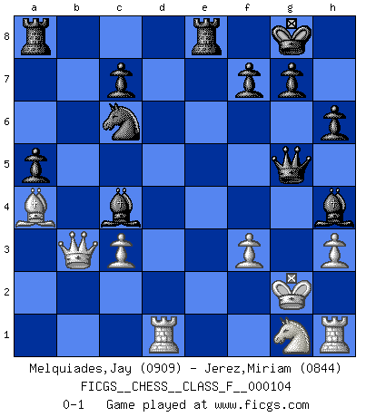 Last move : 0-1 2012 January 19 1:56:27 [Event "FICGS__CHESS__CLASS_F__000104"] [Site "FICGS"] [Date "2011.12.06"] [Round "1"] [White "Melquiades,Jay"] [Black "Jerez,Miriam"] [Result "0-1"] [WhiteElo "0909"] [BlackElo "0844"] 1.e4 Nc6 2.c3 Nf6 3.h3 e5 4.d4 exd4 5.Bg5 Be7 6.Bb5 O-O 7.f3 dxc3 8.bxc3 a6 9.Ba4 b5 10.Bb3 h6 11.Bh4 a5 12.a4 bxa4 13.Bxa4 Bb7 14.Nd2 d5 15.exd5 Nxd5 16.Qb3 Bxh4+ 17.Kd1 Ne3+ 18.Ke2 Nxg2 19.Rd1 Ba6+ 20.Nc4 Re8+ 21.Kf1 Bxc4+ 22.Kxg2 Qg5+ 0-1 KP : Nimzovich defense Kingside Castling by player Black (move 6) Player Black won this chess game. Follow this game move after move (download)That's what Chess is all about. One day you give your opponent a lesson, the next day he gives you one. (Bobby Fischer) Schach sollte überall auf der Welt Schulfach werden. Es fördert die geistige Auseinandersetzung. Es lehrt die Demut in der Niederlage. (Garry Kasparov) En el Ajedrez, cuando menos, el valiente hereda la tierra. (Edmar Mednis) Un journaliste : 'Vous préférez avoir une dame de plus sur l'échiquier ou au lit ?' Boris Spassky : 'Ca dépend de la position.' Warrior pose battles inner weakness and wins focus. You see that there is no war within you. You're on your own side, and you are your own strength. (Terri Guillemets)