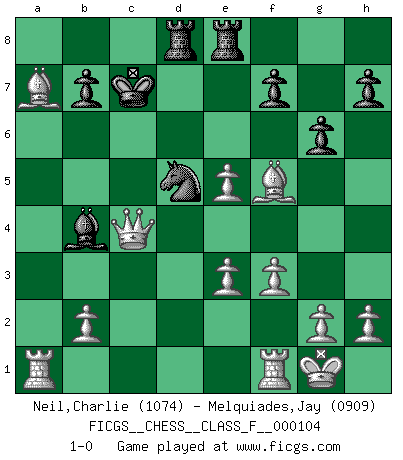 Last move : 1-0 2012 January 4 22:4:18 [Event "FICGS__CHESS__CLASS_F__000104"] [Site "FICGS"] [Date "2011.12.06"] [Round "1"] [White "Neil,Charlie"] [Black "Melquiades,Jay"] [Result "1-0"] [WhiteElo "1074"] [BlackElo "0909"] 1.d4 d5 2.c4 dxc4 3.Nc3 c6 4.a4 Nf6 5.e3 Bg4 6.f3 Be6 7.Nge2 Qa5 8.Bd2 Na6 9.Nb5 cxb5 10.Bxa5 c3 11.Bxc3 Bc4 12.axb5 Bxb5 13.Nf4 O-O-O 14.Bxb5 Nc7 15.Bd3 e5 16.dxe5 Nfd5 17.Nxd5 Nxd5 18.Qe2 Bb4 19.O-O Rhe8 20.Bf5+ Kb8 21.Bd4 g6 22.Bxa7+ Kc7 23.Qc4+ 1-0 Queen's gambit accepted Queenside Castling by player Black (move 13) Kingside Castling by player White (move 19) Player White won this chess game. Follow this game move after move (download)My God, Bobby Fischer plays so simply. (Alexei Suetin) Ich glaube, ich kenne inzwischen die Gründe für mein Versagen: schachliche Charakterfehler. Ich war nie ein Wunderkind und in meiner gesamten menschlichen Entwicklung immer zu langsam. (Viktor Kortschnoi) El juego de Fischer siempre fue nítido, racional y brillante. Uno de los mejores por siempre. (Dave Regis) Donnez-moi un Cavalier en 6e et je gagnerais toutes mes parties. (Steinitz) History is a gallery of pictures in which there are few originals and many copies. (Alexis de Tocqueville)