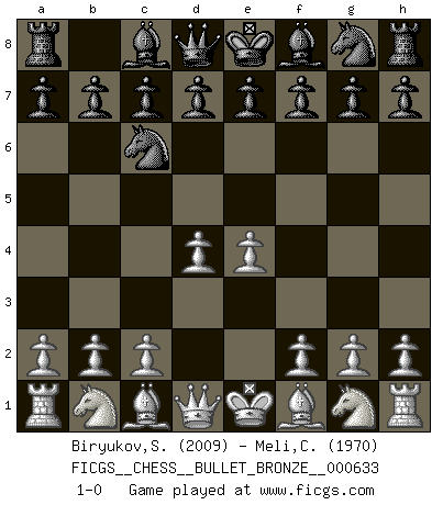 Last move : 1-0 2011 December 6 21:32:32 [Event "FICGS__CHESS__BULLET_BRONZE__000633"] [Site "FICGS"] [Date "2011.12.06"] [Round "1"] [White "Biryukov,Sergey"] [Black "Meli,Cosimo Leonardo"] [Result "1-0"] [WhiteElo "2009"] [BlackElo "1970"] 1.e4 Nc6 2.d4 1-0 This chess game has been lost on time (started : 2011.12.06 21:25:34) KP : Nimzovich defense Player White won this chess game. Follow this game move after move (download)The only thing Chess players have in common is Chess. (Lodewijk Prins) Garry Kasparov war erst in der Großmeister-Organisation GMA, dann in der Profischach-Vereinigung PCA, zum Schluss kehrte er wieder in den Schoß der FIDE zurück. Aber gut, manche Leute sind flexibel (Viswanathan Anand) Un entendimiento a fondo de las continuaciones típicas del mate, hace de las combinaciones de sacrificio mas complicadas conducirlas a ellas no solo sin dificultad, sino casi de una manera natural. (Siegbert Tarrasch) Je ne suis pas le dernier à jouer lâchement des coups douteux pendant le zeïtnot de l'adversaire pour l'achever: en effet les coups qui font le plus peur sont ceux que l'on ne comprend pas. Je me fais souvent peur quand je joue. (Un professeur anonyme) Life is like a ten-speed bicycle: most of us have gears we never use. (Charles M. Schulz)