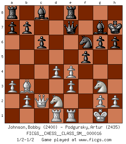 Last move : 1/2-1/2 2012 March 6 11:34:53 [Event "FICGS__CHESS__CLASS_SM__000016"] [Site "FICGS"] [Date "2011.12.07"] [Round "1"] [White "Johnson,Bobby"] [Black "Podgursky,Artur"] [Result "1/2-1/2"] [WhiteElo "2400"] [BlackElo "2435"] 1.d4 d5 2.c4 c6 3.Nf3 Nf6 4.Nc3 e6 5.Bg5 h6 6.Bxf6 Qxf6 7.e3 Nd7 8.Bd3 dxc4 9.Bxc4 g6 10.Qc2 Bg7 11.Ne4 Qe7 12.Bb3 O-O 13.O-O e5 14.Ng3 Kh8 15.Rad1 Re8 16.Rfe1 Kh7 17.a3 e4 18.Nd2 f5 19.f3 Nf6 20.fxe4 1/2-1/2 QGD Slav : 4.Nc3 Kingside Castling by player Black (move 12) Kingside Castling by player White (move 13) This chess game ended in a draw. Follow this game move after move (download)Chess is a part of culture and if a culture is declining then Chess too will decline. (Mikhail Botvinnik) Das Schachspiel hat wie die Liebe, die Musik, die Fähigkeit, den Menschen glücklich zu machen. Ich habe ein leises Gefühl des Bedauerns für jeden, der das Schachspiel nicht kennt, so wie ich jeden bedaure, der die Liebe nicht kennt. (Siegbert Tarrasch) Si un gobernante no entiende al Ajedrez, ¿como puede governar él un reinado?. (El Rey Khusros II) Tous ces prétendus hommes politiques sont les pions, les Cavaliers, les Tours ou les Fous d'une partie d'échecs qui se jouera tant qu'un hasard ne renversera pas l'échiquier. (Honoré de Balzac) Never was anything great achieved without danger. (Niccolo Machiavelli)