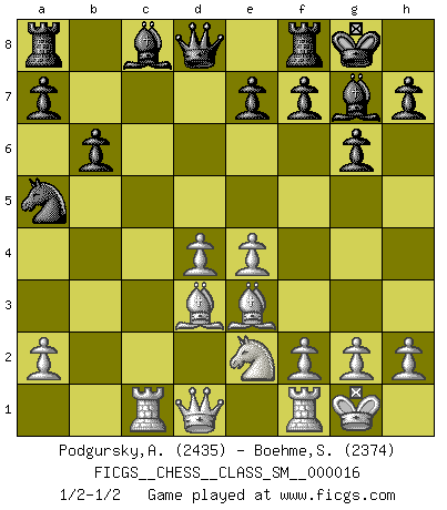 Last move : 1/2-1/2 2012 May 31 22:34:26 [Event "FICGS__CHESS__CLASS_SM__000016"] [Site "FICGS"] [Date "2011.12.07"] [Round "1"] [White "Podgursky,Artur"] [Black "Boehme,Sebastian"] [Result "1/2-1/2"] [WhiteElo "2435"] [BlackElo "2374"] 1.d4 Nf6 2.c4 g6 3.Nc3 d5 4.cxd5 Nxd5 5.e4 Nxc3 6.bxc3 Bg7 7.Bc4 c5 8.Ne2 O-O 9.O-O Nc6 10.Be3 cxd4 11.cxd4 Na5 12.Bd3 b6 13.Rc1 1/2-1/2 King's Indian defense, 3.Nc3 Kingside Castling by player Black (move 8) Kingside Castling by player White (move 9) This chess game ended in a draw. Follow this game move after move (download)If Chess is a science, it's a most inexact one. If Chess is an art, it is too exacting to be seen as one. If Chess is a sport, it's too esoteric. If Chess is a game, it's too demanding to be just a game. If Chess is a mistress, she's a demanding one. If Chess is a passion, it's a rewarding one. If Chess is life, it's a sad one. (Unknown) Man wirke der falschen Auffassung entgegen, als ob jeder Zug Unmittelbares zu leisten habe; auch Werte- und Ruhezüge haben ihre Existenzberechtigung. (Aaron Nimzowitsch) El jugador táctico debe saber que hacer cuando algo se debe de hacer. El estratégico debe saber que hacer cuando nada se debe de hacer. (Savielly Tartakover) Une platitude souvent récitée à propos des Echecs est qu'une des choses les plus difficiles à réaliser est de gagner une position gagnante. Cela ne manque pas de sens mais, pour ma part, j'ai toujours trouvé plus difficile de gagner une position perdante. (Tim Krabbe) I've never seen so many men wasted so badly. (Blondie in The Good, The Bad and The Ugly)
