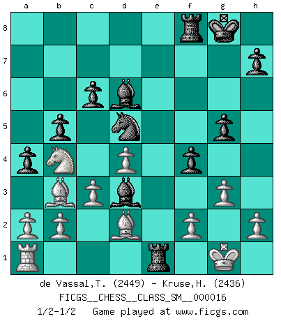 Last move : 1/2-1/2 2012 April 12 23:25:53 [Event "FICGS__CHESS__CLASS_SM__000016"] [Site "FICGS"] [Date "2011.12.07"] [Round "1"] [White "de Vassal,Thibault"] [Black "Kruse,Herbert"] [Result "1/2-1/2"] [WhiteElo "2449"] [BlackElo "2436"] 1.e4 e5 2.Nf3 Nc6 3.Bb5 a6 4.Ba4 Nf6 5.O-O Be7 6.Re1 b5 7.Bb3 O-O 8.c3 d5 9.exd5 Nxd5 10.Nxe5 Nxe5 11.Rxe5 c6 12.d4 Bd6 13.Re1 Qh4 14.g3 Qh3 15.Re4 g5 16.Qf1 Qxf1+ 17.Kxf1 Bf5 18.Re1 Rae8 19.Be3 Bd3+ 20.Kg1 f5 21.Na3 f4 22.Bd2 a5 23.Nc2 a4 24.Nb4 Rxe1+ 1/2-1/2 Ruy Lopez : Closed, 7...O-O Kingside Castling by player White (move 5) Kingside Castling by player Black (move 7) This chess game ended in a draw. Follow this game move after move (download)You cannot play at Chess if you are kind-hearted. (French Proverb) Ich war schon mal beim Dopingtest. Da musste ich Urin abgeben, während Dritte zusahen. (Elisabeth Pähtz) Fischer deseaba darle a los Rusos una sopa de su propia medicina. (Larry Evans) Le moment que je préfère le plus dans une rencontre, c'est celui où je sens que la personnalité de l'adversaire se brise. (Robert Fischer) Be who you are, and say what you feel because those who mind don't matter, and those who matter don't mind. (Dr Seuss)