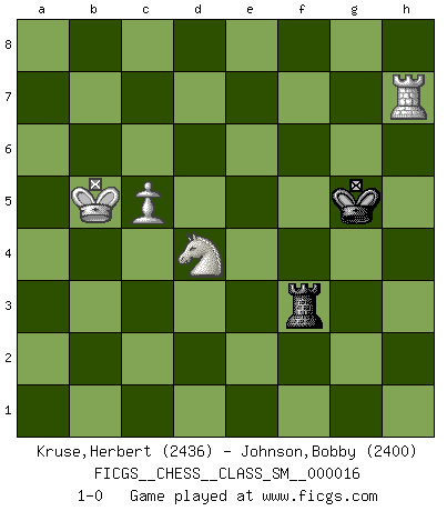 Last move : 1-0 2012 December 27 3:1:33 [Event "FICGS__CHESS__CLASS_SM__000016"] [Site "FICGS"] [Date "2011.12.07"] [Round "1"] [White "Kruse,Herbert"] [Black "Johnson,Bobby"] [Result "1-0"] [WhiteElo "2436"] [BlackElo "2400"] 1.e4 c5 2.Nf3 d6 3.d4 cxd4 4.Nxd4 Nf6 5.Nc3 a6 6.Be3 e5 7.Nb3 Be6 8.f3 Be7 9.Qd2 Nbd7 10.g4 O-O 11.g5 Nh5 12.O-O-O Qc7 13.Kb1 Nb6 14.f4 Nxf4 15.Bxf4 exf4 16.Qxf4 Rac8 17.Nd4 Qc5 18.h4 Qe5 19.Qe3 Bd8 20.Qf3 Bc7 21.a3 Bb8 22.Be2 d5 23.Nxe6 fxe6 24.Qe3 Bc7 25.Bg4 Rce8 26.Qh3 dxe4 27.Rhe1 Rf4 28.Ne2 R4f8 29.Qb3 Kh8 30.Nd4 Rf4 31.Bxe6 Rd8 32.c3 g6 33.Ka1 e3 34.Rd3 Re4 35.Bh3 Re8 36.Bg2 Qg3 37.Re2 R4e7 38.Bxb7 Qxh4 39.Bc6 Rb8 40.Rdxe3 Rxe3 41.Rxe3 Qxg5 42.Qe6 Rg8 43.Ka2 Bd8 44.a4 Bf6 45.Qf7 Be5 46.Rh3 Bg7 47.Ne6 Qf5 48.Qxf5 gxf5 49.a5 Nc4 50.b4 Be5 51.Bb7 Re8 52.Nc5 Bd6 53.Nxa6 Nxa5 54.bxa5 Re5 55.Rd3 Rxa5+ 56.Kb3 Rb5+ 57.Kc2 Be5 58.Bf3 Ra5 59.Nb4 Kg7 60.Nc6 Rc5 61.Kb3 Bh2 62.Kb4 Bg1 63.Rd1 Bf2 64.Rd2 Be3 65.Re2 f4 66.Rxe3 Rf5 67.Re7+ Kh6 68.c4 Rf8 69.c5 Kg6 70.Be4+ Kg5 71.Rxh7 f3 72.Bxf3 Rf4+ 73.Kb5 Rxf3 74.Nd4 1-0 Sicilian : Najdorf, Byrne (English) attack Kingside Castling by player Black (move 10) Queenside Castling by player White (move 12) 10 pieces endgame at move 55 : White KRBNP , Black KRBPP WHITE : King + 1 Rook 1 Bishop 1 Knight 1 Pawn BLACK : King + 1 Rook 1 Bishop 2 Pawns 9 pieces endgame at move 66 : White KRBNP , Black KRPP WHITE : King + 1 Rook 1 Bishop 1 Knight 1 Pawn BLACK : King + 1 Rook 2 Pawns 8 pieces endgame at move 71 : White KRBNP , Black KRP WHITE : King + 1 Rook 1 Bishop 1 Knight 1 Pawn BLACK : King + 1 Rook 1 Pawn 7 pieces endgame at move 72 : White KRBNP , Black KR WHITE : King + 1 Rook 1 Bishop 1 Knight 1 Pawn BLACK : King + 1 Rook 6 pieces endgame at move 73 : White KRNP , Black KR WHITE : King + 1 Rook 1 Knight 1 Pawn BLACK : King + 1 Rook Player White won this chess game. Follow this game move after move (download)Chess is a terrible game. If you have no center, your opponent has a freer position. If you do have a center, then you really have something to worry about ! (Siegbert Tarrasch) Wenn ich einen Club besuche, sind die Spieler stumm vor Staunen. (José Raúl Capablanca) Nos gusta pensar. (Gary Kasparov) D'abord les bases : Jouez et étudiez, puis étudiez et jouez, ensuite jouez et étudiez, puis étudiez et jouez. Deuxièmement : Donnez toujours le meilleur de vous-même ! (Ken Smith) The problem with troubleshooting is that trouble shoots back. (Anonymous)