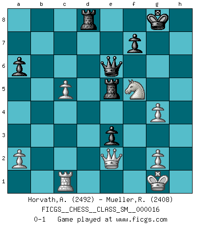 Last move : 0-1 2012 April 22 14:16:26 [Event "FICGS__CHESS__CLASS_SM__000016"] [Site "FICGS"] [Date "2011.12.07"] [Round "1"] [White "Horvath,Alexander"] [Black "Mueller,Robert"] [Result "0-1"] [WhiteElo "2492"] [BlackElo "2408"] 1.e4 c5 2.Nf3 d6 3.d4 cxd4 4.Nxd4 Nf6 5.Nc3 a6 6.Be3 e5 7.Nb3 Be6 8.f3 h5 9.Nd5 Bxd5 10.exd5 Nbd7 11.Qd2 g6 12.Be2 Bg7 13.O-O O-O 14.Na5 Qc7 15.c4 e4 16.f4 Ng4 17.Bxg4 hxg4 18.Rab1 Nc5 19.f5 gxf5 20.b4 Nd3 21.Rxf5 Rae8 22.Qe2 Ne5 23.Bf4 Qd7 24.Bxe5 Qxf5 25.Bxg7 Kxg7 26.Nxb7 Qg6 27.c5 dxc5 28.bxc5 e3 29.Rc1 Re5 30.d6 g3 31.d7 Qf5 32.hxg3 Qxd7 33.Nd6 Qe6 34.g4 Kg8 35.Nf5 Rd8 0-1 Robert Mueller Thank you for an interesting game Sicilian : Najdorf, Byrne (English) attack Kingside Castling by player White (move 13) Kingside Castling by player Black (move 13) Player Black won this chess game. Follow this game move after move (download)Pawn endings are to Chess what putting is to golf. (Cecil Purdy) Über Frauen: Chess is better. (Robert James Fischer) El Rey es una pieza de pelea. ¡Usenlo!. (Wilhelm Steinitz) Il (Jacob Murray) ne joue pas pour le bon coup, mais pour le meilleur. (Eloi Relange) First of all, we have to go back to the classical time control. (Anatoly Karpov)