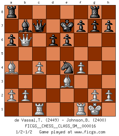 Last move : 1/2-1/2 2012 March 5 0:29:6 [Event "FICGS__CHESS__CLASS_SM__000016"] [Site "FICGS"] [Date "2011.12.07"] [Round "1"] [White "de Vassal,Thibault"] [Black "Johnson,Bobby"] [Result "1/2-1/2"] [WhiteElo "2449"] [BlackElo "2400"] 1.e4 c5 2.Nf3 e6 3.d4 cxd4 4.Nxd4 a6 5.Bd3 Nf6 6.O-O d6 7.c4 Be7 8.Nc3 b6 9.Be3 Bb7 10.f4 Nbd7 11.Rc1 Nc5 12.Bc2 Nfxe4 13.Nxe4 Nxe4 14.Ba4+ Kf8 15.Nc6 Qc7 16.Nxe7 Kxe7 17.Qd4 Rhg8 18.Qxb6 1/2-1/2 Sicilian : Kan, 5.Bd3 Kingside Castling by player White (move 6) This chess game ended in a draw. Follow this game move after move (download)The older I grow, the more I value pawns. (Paul Keres) Die jungen Leute sollen verstehen, dass sie noch etwas von mir lernen können und müssen. (Viktor Kortschnoi) Ciertamente el estado mental actual de Bobby Fischer es una tragedia. Uno de los mas grandes jugadores de Ajedrez del mundo -el orgullo y pena del Ajedrez Americano. (Frank Brady) Botvinnik disait en comparant les échecs à la musique: Il existe une science dont le but est l'étude de l'acoustique et des sons. Mais il y a aussi un art qui se sert de l'océan des sons : c'est la musique. De toute évidence, il en est de même pour la pensée. La logique est l'étude des lois de la réflexion et les échecs reflètent, en tant qu'art, le côté logique de la réflexion, sous la forme d'images artistiques... Extrait de Fischer - Spassky, Reykjavik 1972 par Alexander & F. Wyndham (Ed. Solar), p 37. Sometimes it pays to stay in bed in Monday, rather than spending the rest of the week debugging Monday's code. (Dan Salomon)