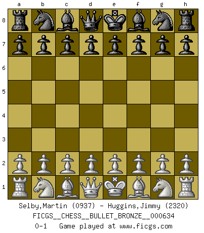 Last move : 0-1 2011 December 8 3:44:44 [Event "FICGS__CHESS__BULLET_BRONZE__000634"] [Site "FICGS"] [Date "2011.12.08"] [Round "1"] [White "Selby,Martin"] [Black "Huggins,Jimmy"] [Result "0-1"] [WhiteElo "0937"] [BlackElo "2320"] 0-1 This chess game has been lost on time (started : 2011.12.08 0:32:54) Player Black won this chess game. Follow this game move after move (download)My opponents make good moves too. Sometimes I don't take these things into consideration. (Bobby Fischer) Der Bart als Geschlechtszeichen mitten im Gesicht ist obszön. Daher gefällt er den Weibern. [Zugegeben, kein Schachzitat, aber unglaublich originell] (Arthur Schopenhauer) El Ajedrez es una hermosa aventura. (Bent Larsen) Tous ces prétendus hommes politiques sont les pions, les Cavaliers, les Tours ou les Fous d'une partie d'échecs qui se jouera tant qu'un hasard ne renversera pas l'échiquier. (Honoré de Balzac) There are more things in heaven and earth than practically anywhere else. (Unknown)