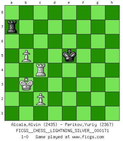 Last move : 1-0 2011 December 8 15:42:6 [Event "FICGS__CHESS__LIGHTNING_SILVER__000171"] [Site "FICGS"] [Date "2011.12.08"] [Round "1"] [White "Alcala,Alvin"] [Black "Perikov,Yuriy"] [Result "1-0"] [WhiteElo "2435"] [BlackElo "2367"] 1.e4 c5 2.Nf3 d6 3.d4 cxd4 4.Nxd4 Nf6 5.Nc3 a6 6.Be3 e5 7.Nb3 Be7 8.f3 Be6 9.Qd2 Nbd7 10.g4 h6 11.h4 b5 12.a4 b4 13.Nd5 Bxd5 14.exd5 e4 15.Bd4 exf3 16.O-O-O O-O 17.Qf4 Nh7 18.Kb1 Bxh4 19.Bd3 Bg5 20.Qxd6 Re8 21.Bxa6 Nb8 22.Qxd8 Rxd8 23.Bb5 Rxd5 24.Bf2 Nf6 25.Rxd5 Nxd5 26.Rd1 Ne3 27.Bxe3 Bxe3 28.Rd8+ Kh7 29.Rd3 Bg1 30.Rxf3 Ra7 31.Nc1 f6 32.Nd3 Na6 33.b3 Kg6 34.Rf5 Kf7 35.a5 Bh2 36.Bxa6 Rxa6 37.Nxb4 Ra8 38.Rb5 g6 39.Nd3 f5 40.gxf5 h5 41.fxg6+ Kxg6 42.Nf2 Bf4 43.Nh3 Be3 44.Rd5 Rf8 45.Rd3 Rf3 46.Nf2 h4 47.a6 Rg3 48.Ne4 Rg1+ 49.Kb2 Ba7 50.Nc3 Kf5 51.Rf3+ Ke5 52.Nb5 Rg7 53.b4 Bg1 54.Rh3 Rg6 55.a7 Ra6 56.Rxh4 Bxa7 57.Nxa7 Rxa7 58.Rc4 Ra4 59.Kb3 Ra7 60.b5 1-0 Sicilian : Najdorf, Byrne (English) attack Queenside Castling by player White (move 16) Kingside Castling by player Black (move 16) 10 pieces endgame at move 41 : White KRNPPP , Black KRBP WHITE : King + 1 Rook 1 Knight 3 Pawns BLACK : King + 1 Rook 1 Bishop 1 Pawn 9 pieces endgame at move 56 : White KRNPPP , Black KRB WHITE : King + 1 Rook 1 Knight 3 Pawns BLACK : King + 1 Rook 1 Bishop 8 pieces endgame at move 56 : White KRNPP , Black KRB WHITE : King + 1 Rook 1 Knight 2 Pawns BLACK : King + 1 Rook 1 Bishop 7 pieces endgame at move 57 : White KRNPP , Black KR WHITE : King + 1 Rook 1 Knight 2 Pawns BLACK : King + 1 Rook 6 pieces endgame at move 57 : White KRPP , Black KR WHITE : King + 1 Rook 2 Pawns BLACK : King + 1 Rook Player White won this chess game. Follow this game move after move (download)He who fears an isolated Queen's Pawn should give up Chess. (Siegbert Tarrasch) Wie, soll nun auch die Opposition abgeschafft werden? Ja, es tut mir leid, Ihnen diesen Schmerz nicht ersparen zu können. (Aaron Nimzowitsch) Cuando tu casa esta en llamas, no puedes ser molestado por tus vecinos. O, como decinos en Ajedrez, si tu Rey esta bajo ataque, no te preocupa perder un Peón del lado de la Reina. (Gary Kasparov) Le moment que je préfère le plus dans une rencontre, c'est celui où je sens que la personnalité de l'adversaire se brise. (Robert Fischer) Experiences are the keys to life. (Daniel Parmet)