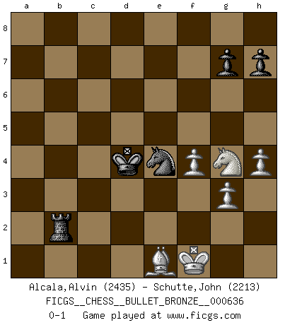 Last move : 0-1 2011 December 8 19:34:37 [Event "FICGS__CHESS__BULLET_BRONZE__000636"] [Site "FICGS"] [Date "2011.12.08"] [Round "1"] [White "Alcala,Alvin"] [Black "Schutte,John"] [Result "0-1"] [WhiteElo "2435"] [BlackElo "2213"] 1.d4 d5 2.c4 e6 3.Nf3 Nf6 4.g3 dxc4 5.Bg2 a6 6.O-O Nc6 7.e3 Bd7 8.Qe2 b5 9.b3 cxb3 10.axb3 Bd6 11.Bb2 O-O 12.Rc1 Nd5 13.Nc3 Qe7 14.Nd2 Ncb4 15.Nce4 a5 16.Nc5 Bxc5 17.Rxc5 c6 18.R5c1 f6 19.f4 Be8 20.Ne4 Bf7 21.Nc5 f5 22.Qd2 Rfd8 23.Ba3 Qc7 24.Re1 Qb6 25.Rac1 Na6 26.Nd3 Bh5 27.Rc2 Kh8 28.Rec1 Be8 29.Ra2 b4 30.Bb2 Nac7 31.Nc5 Bf7 32.Ba1 Nb5 33.Bf1 Rd6 34.Bc4 Bh5 35.Kg2 Rad8 36.Qe1 Re8 37.Rd2 R6d8 38.Bb2 Qa7 39.h3 Nd6 40.Bd3 Kg8 41.Na4 Rf8 42.Rdc2 Rc8 43.Ba1 Rf6 44.Rc5 Rg6 45.R5c2 Ne4 46.Bxe4 fxe4 47.Rxc6 Rxc6 48.Rxc6 Bf3+ 49.Kh2 Ne7 50.Rc1 Qb8 51.Qf2 Rh6 52.Rc5 Nd5 53.Bb2 Qd8 54.h4 Bd1 55.Qf1 Bxb3 56.Qa6 Kf7 57.Qb7+ Qe7 58.Qxe7+ Kxe7 59.Rxa5 Nxe3 60.Ra7+ Kd6 61.Nc5 Bd5 62.Bc1 Nf5 63.Na6 e3 64.Nb8 Bc6 65.Ra6 e2 66.Rxc6+ Kd5 67.Rc5+ Ke4 68.Nc6 b3 69.Bd2 e5 70.Nxe5 Ra6 71.Kg2 Ra2 72.Be1 b2 73.Rb5 Ne3+ 74.Kf2 Nd1+ 75.Kg1 Ra1 76.d5 Nc3 77.Rb4+ Kxd5 78.Kf2 Ne4+ 79.Kxe2 b1Q 80.Rxb1 Rxb1 81.Ng4 Rb2+ 82.Kf1 Kd4 0-1 Queen's gambit declined Kingside Castling by player White (move 6) Kingside Castling by player Black (move 11) Promotion Queen by player Black (move 79) Player Black won this chess game. Follow this game move after move (download)First-class players lose to second class players because second-class players sometimes play a first-class game. (Tarrasch) Der Schachmeister von Heute braucht Courage, einen Killerinstinkt, Ausdauer und Arroganz. (Larry Evans) El Rey es una pieza de pelea. ¡Usenlo!. (Wilhelm Steinitz) Les Echecs sont et restent toujours un combat, un combat intégral comme la boxe, la lutte ou un autre sport, et où il doit y avoir un vainqueur et un vaincu. (Joseph Emil Diemer) My poor ole parrot... Is not in the circulation of displays ....poo hoo hoo :) (Wayne Lowrance's enigma)