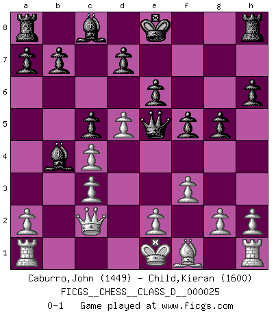 Last move : 0-1 2007 January 14 23:44:56 [Event "FICGS__CHESS__CLASS_D__000025"] [Site "FICGS"] [Date "2007.01.09"] [Round "1"] [White "Caburro,John"] [Black "Child,Kieran"] [Result "0-1"] [WhiteElo "1449"] [BlackElo "1600"] 1.d4 Nf6 2.c4 Nc6 3.Nf3 e6 4.Nc3 Bb4 5.Bg5 h6 6.Bh4 g5 7.Bg3 Ne4 8.Qc2 f5 9.Be5 Nxe5 10.Nxe5 c5 11.d5 Qf6 12.f3 Nxc3 13.bxc3 Qxe5 0-1 Kevitz-Trajkovich defense Player Black won this chess game. Follow this game move after move (download)The winner of the game is the player who makes the next-to-last mistake. (Savielly Tartakover) Der Bart als Geschlechtszeichen mitten im Gesicht ist obszön. Daher gefällt er den Weibern. [Zugegeben, kein Schachzitat, aber unglaublich originell] (Arthur Schopenhauer) El Ajedrez es una hermosa aventura. (Bent Larsen) Même un GMI sait rarement calculer sur plus de cinq coups une attaque à sacrifices. (Rudolf Spielmann) No, no, you're not thinking; you're just being logical. (Niels Bohr)