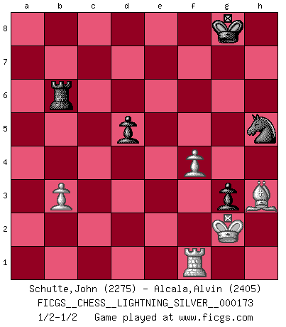 Last move : 1/2-1/2 2011 December 8 21:0:28 [Event "FICGS__CHESS__LIGHTNING_SILVER__000173"] [Site "FICGS"] [Date "2011.12.08"] [Round "1"] [White "Schutte,John"] [Black "Alcala,Alvin"] [Result "1/2-1/2"] [WhiteElo "2275"] [BlackElo "2405"] 1.e4 c5 2.Nf3 d6 3.d4 cxd4 4.Nxd4 Nf6 5.Nc3 a6 6.Be3 e5 7.Nb3 Be6 8.Be2 Be7 9.Qd3 O-O 10.O-O Nbd7 11.Nd5 Bxd5 12.exd5 Rc8 13.c4 Ne8 14.Qd2 f5 15.Qb4 b6 16.f4 Rf7 17.Qa3 a5 18.Rac1 g6 19.Rfd1 exf4 20.Nd4 Bg5 21.Ne6 Qe7 22.Bd2 Nc5 23.Bf3 Bf6 24.Bxf4 g5 25.Bg3 g4 26.Be2 Nxe6 27.dxe6 Qxe6 28.Rc2 Be5 29.Bxe5 Qxe5 30.c5 d5 31.c6 Nc7 32.Qb3 Rb8 33.h3 h5 34.a4 Re7 35.Rcd2 Rbe8 36.Qxb6 f4 37.Qf2 Rg7 38.Kh1 Qf6 39.Rf1 Re4 40.Bd3 Rxa4 41.Qb6 Rf7 42.Kg1 f3 43.gxf3 Rb4 44.Qe3 Re7 45.Qa7 gxh3 46.Kh1 Rg7 47.f4 Qxc6 48.Qxa5 Qd6 49.Rdf2 h4 50.Qa3 Rg3 51.Rc2 Ne6 52.Rc3 Rb6 53.Qxd6 Rxd6 54.Bf5 Ng7 55.Rxg3 hxg3 56.Bxh3 Nh5 57.Kg2 Rb6 58.b3 1/2-1/2 Sicilian : Najdorf, Byrne (English) attack Kingside Castling by player Black (move 9) Kingside Castling by player White (move 10) 10 pieces endgame at move 56 : White KRBPP , Black KRNPP WHITE : King + 1 Rook 1 Bishop 2 Pawns BLACK : King + 1 Rook 1 Knight 2 Pawns This chess game ended in a draw. Follow this game move after move (download)With or without the title, Bobby Fischer was unquestionably the greatest player of his time. (Burt Hochberg) Ich kenne Menschen, die allen Willen der Welt besitzen und doch nicht Schach spielen können. (Robert James Fischer) Fischer no está bajo la obligación de nadie. (Joseph Platz) La tactique, c'est ce que vous faites quand il y a quelque chose à faire; la stratégie, c'est ce que vous faites quand il n'y a rien à faire. (Savielli Tartacower) Every now and then a man's mind is stretched by a new idea and never shrinks back to its former dimensions. (Oliver Wendell Holmes, Sr.)