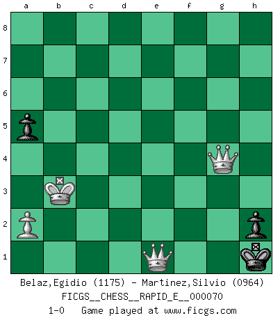 Last move : 1-0 2012 April 15 11:20:7 [Event "FICGS__CHESS__RAPID_E__000070"] [Site "FICGS"] [Date "2011.12.10"] [Round "1"] [White "Belaz,Egidio"] [Black "Martinez,Silvio"] [Result "1-0"] [WhiteElo "1175"] [BlackElo "0964"] 1.e4 Nc6 2.d4 d5 3.e5 e6 4.Nf3 Bb4+ 5.c3 Ba5 6.Bb5 Bd7 7.b4 Bb6 8.O-O a6 9.Ba4 Nge7 10.Bg5 O-O 11.Nbd2 h6 12.Bh4 Nf5 13.Bg3 Nxg3 14.hxg3 Ne7 15.c4 dxc4 16.Nxc4 Bxa4 17.Qxa4 Bxd4 18.Rad1 b5 19.Qb3 Nc6 20.Na5 Nxa5 21.bxa5 Qd5 22.Qc2 c5 23.Rfe1 Qc4 24.Nxd4 cxd4 25.Qxc4 bxc4 26.Rxd4 c3 27.Rc4 Rfc8 28.Rxc8+ Rxc8 29.Rc1 g5 30.Rc2 Kg7 31.Kf1 Kg6 32.f4 Rc7 33.Ke2 Kf5 34.Kf3 g4 35.Ke3 Rc5 36.Kd4 Rxa5 37.Kxc3 Ke4 38.Re2+ Kd5 39.Kb3 Kd4 40.Rd2+ Ke3 41.Rd7 Rb5+ 42.Kc4 Kf2 43.Rxf7 Kxg2 44.Rf6 Rb6 45.f5 Rc6+ 46.Kb3 h5 47.fxe6 Kxg3 48.e7 Rc8 49.Rf8 Rxf8 50.exf8Q h4 51.Qd6 h3 52.Qd3+ Kg2 53.Qe4+ Kg1 54.Qxg4+ Kh2 55.e6 a5 56.e7 Kh1 57.e8Q h2 58.Qe1+ 1-0 KP : Nimzovich defense Kingside Castling by player White (move 8) Kingside Castling by player Black (move 10) 10 pieces endgame at move 47 : White KRPPP , Black KRPPP WHITE : King + 1 Rook 3 Pawns BLACK : King + 1 Rook 3 Pawns 9 pieces endgame at move 49 : White KPPP , Black KRPPP WHITE : King + 3 Pawns BLACK : King + 1 Rook 3 Pawns Promotion Queen by player White (move 50) 8 pieces endgame at move 50 : White KQPP , Black KPPP WHITE : King + 1 Queen 2 Pawns BLACK : King + 3 Pawns 7 pieces endgame at move 54 : White KQPP , Black KPP WHITE : King + 1 Queen 2 Pawns BLACK : King + 2 Pawns Promotion Queen by player White (move 57) Player White won this chess game. Follow this game move after move (download)Live, lose, and learn, by observing your opponent how to win. (Amber Steenbock) Schach ist mein Leben, meine Leidenschaft, was ich gelernt habe und seit meinem 14. Lebensjahr profimässig praktiziere. Darauf zu verzichten, würde mir sehr schwer fallen. (Viktor Kortschnoi) Nos gusta pensar. (Gary Kasparov) On a dit que l'homme se distingue de l'animal par le fait qu'il achète plus de livres qu'il ne peut en lire. Je voudrais suggérer qu'inclure à la liste des livres quelques livres d'échecs rendrait la distinction manifeste. (Edward Lasker) Follow your passion, and success will follow you. (Arthur Buddhold)