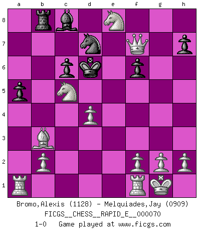 Last move : 1-0 2012 January 6 21:1:43 [Event "FICGS__CHESS__RAPID_E__000070"] [Site "FICGS"] [Date "2011.12.10"] [Round "1"] [White "Bromo,Alexis"] [Black "Melquiades,Jay"] [Result "1-0"] [WhiteElo "1128"] [BlackElo "0909"] 1.d4 d5 2.c4 dxc4 3.Nc3 c6 4.e3 e6 5.Bxc4 Bb4 6.Bd2 Ne7 7.a3 Nd7 8.axb4 Nb6 9.Bb3 Ned5 10.Qf3 a5 11.bxa5 Nd7 12.e4 Nb4 13.Nh3 b6 14.O-O bxa5 15.e5 Rb8 16.Na4 f6 17.exf6 gxf6 18.Bxb4 Rf8 19.Bxf8 Kxf8 20.Ng5 Qe7 21.Nxe6+ Ke8 22.Qh5+ Qf7 23.Ng7+ Kd8 24.Qxf7 Kc7 25.Nc5 Kd6 26.Ne8+ 1-0 Queen's gambit accepted Kingside Castling by player White (move 14) Player White won this chess game. Follow this game move after move (download)Chess is no whit inferior to the violin, and we have a large number of professional violinists. (Mikhail Botvinnik) Im Reiche der Wirklichkeit ist man nie so glücklich wie im Reiche der Gedanken. (Arthur Schopenhauer) En un gambito tu regalas un Peón por el bién de tomar un juego perdido. (Samuel Standige Boden) Celui qui prend des risques peut perdre, celui qui n'en prend pas perd toujours. (Xavier Tartacover) Quotation,n.: The act of repeating erroneously the words of another. The words erroneously repeated. (Ambrose Bierce, The Devil's Dictionary)