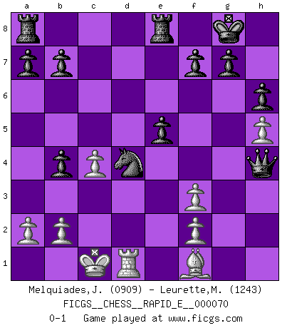 Last move : 0-1 2012 January 5 18:37:18 [Event "FICGS__CHESS__RAPID_E__000070"] [Site "FICGS"] [Date "2011.12.10"] [Round "1"] [White "Melquiades,Jay"] [Black "Leurette,Marc-Antoine"] [Result "0-1"] [WhiteElo "0909"] [BlackElo "1243"] 1.e4 e5 2.Nf3 Nc6 3.c3 Nf6 4.Ng5 Be7 5.Qb3 O-O 6.h4 h6 7.d3 d5 8.Nf3 dxe4 9.dxe4 Nxe4 10.c4 Bb4+ 11.Bd2 Bxd2+ 12.Nbxd2 Nxd2 13.Nxd2 Nd4 14.Qc3 Bf5 15.O-O-O c5 16.Nf3 Re8 17.h5 Bg4 18.Rh4 Bxf3 19.gxf3 Qxh4 20.Qb4 cxb4 0-1 Ponziani : Jaenisch counter-attack Kingside Castling by player Black (move 5) Queenside Castling by player White (move 15) Player Black won this chess game. Follow this game move after move (download)I have always a slight feeling of pity for the man who has no knowledge of Chess. (Siegbert Tarrasch) Obwohl ich vom Stil her kaum zu den Priestern der Schachkunst gezählt werde, halte ich Schach doch für eine Kunst. (Tigran Petrosjan) Una buena ofensiva y una buena defensa, comienzan ambas con un buen desarrollo. (Bruce A. Moon) La solitude du joueur d'Echecs à l'approche du mat est semblable à celle du condamné. (Francis Szpiner) For to win one hundred victories in one hundred battles is not the acme of skill. To subdue the enemy without fighting is the acme of skill. (Sun Tzu)