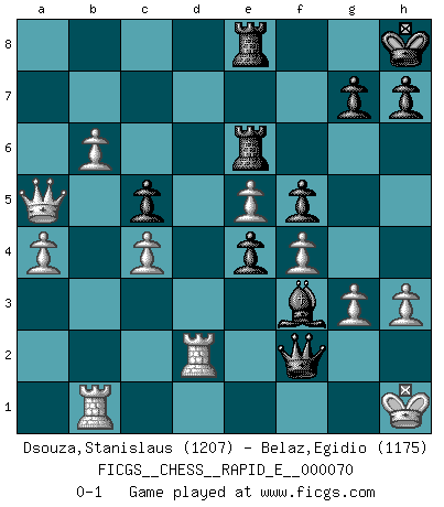 Last move : 0-1 2012 March 10 21:18:24 [Event "FICGS__CHESS__RAPID_E__000070"] [Site "FICGS"] [Date "2011.12.10"] [Round "1"] [White "Dsouza,Stanislaus"] [Black "Belaz,Egidio"] [Result "0-1"] [WhiteElo "1207"] [BlackElo "1175"] 1.e4 e5 2.Nf3 Nc6 3.Bc4 Nf6 4.d3 d5 5.exd5 Nxd5 6.Nc3 Nxc3 7.bxc3 Be7 8.O-O O-O 9.d4 Na5 10.Bb3 e4 11.Ne5 Nxb3 12.cxb3 Bd6 13.f4 f6 14.Nc4 Be7 15.Be3 b6 16.Qc2 f5 17.Ne5 Ba6 18.Rfd1 Qe8 19.b4 Bd6 20.a4 Bxe5 21.dxe5 Bd3 22.Qb2 a6 23.Qb3+ Kh8 24.c4 Qe6 25.Rdc1 Rfd8 26.h3 Qg6 27.Ra2 Qe6 28.Rd2 a5 29.b5 c5 30.Kh2 Re8 31.g3 Qg6 32.Rg1 Rad8 33.Rgd1 Qe6 34.Rc1 Qh6 35.Qc3 Qh5 36.Rcd1 Qf3 37.Bg1 Re6 38.Bxc5 bxc5 39.Qxa5 Rde8 40.b6 Be2 41.Rb1 Qf2+ 42.Kh1 Bf3+ 0-1 Two knights defense (Modern Bishop's Opening) Kingside Castling by player White (move 8) Kingside Castling by player Black (move 8) Player Black won this chess game. Follow this game move after move (download)Methodical thinking is of more use in Chess than inspiration. (C. J. S. Purdy) Schach sollte überall auf der Welt Schulfach werden. Es fördert die geistige Auseinandersetzung. Es lehrt die Demut in der Niederlage. (Garry Kasparov) Cuando estes solo, cuando te sientas un extraño en el mundo, juega al Ajedrez. Esto levantará tu espiritu y será tu consejero de guerra. (Aristóteles) C'est la seule position que je connaisse où les deux camps sont mals. Propos prêtés à V. Anand. 98% of all statistics are made up. (Author unknown)