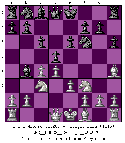 Last move : 1-0 2012 January 17 18:19:23 [Event "FICGS__CHESS__RAPID_E__000070"] [Site "FICGS"] [Date "2011.12.10"] [Round "1"] [White "Bromo,Alexis"] [Black "Podogov,Ilia"] [Result "1-0"] [WhiteElo "1128"] [BlackElo "1115"] 1.d4 d5 2.c4 e6 3.Nc3 c6 4.Nf3 Nf6 5.Bg5 Bb4 6.e3 h6 7.Bh4 1-0 This chess game has been lost on time (started : 2011.12.10 14:13:8) QGD : Semi-Slav Player White won this chess game. Follow this game move after move (download)The winner of the game is the player who makes the next-to-last mistake. (Savielly Tartakover) Verschiedene, sehr schätzbare und im Laufe des Lebens nützliche Eigenschaften des Geistes können durch das Schachspiel erworben und gekräftigt werden, so dass sie zu Gewohnheiten werden, die uns nie im Stich lassen. (Benjamin Franklin) Un mal plan es mejor que no tener ningún plan. (Frank Marshall) On n'a jamais que l'âge auquel on a commence à jouer aux échecs car après on cesse de vieillir. (Capablanca) Nowadays, anyone who cannot speak English and is incapable of using the Internet is regarded as backward. (Al-Waleed bin Talal)