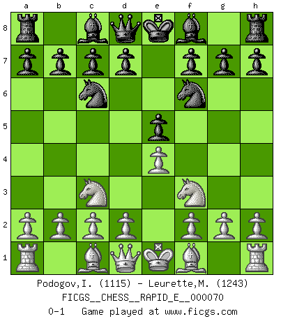 Last move : 0-1 2012 January 14 17:59:50 [Event "FICGS__CHESS__RAPID_E__000070"] [Site "FICGS"] [Date "2011.12.10"] [Round "1"] [White "Podogov,Ilia"] [Black "Leurette,Marc-Antoine"] [Result "0-1"] [WhiteElo "1115"] [BlackElo "1243"] 1.e4 e5 2.Nf3 Nc6 3.Nc3 Nf6 0-1 This chess game has been lost on time (started : 2011.12.10 14:13:8) Four knights game Player Black won this chess game. Follow this game move after move (download)There's never before been a Chess player with such a thorough knowledge of the intricacies of the game and such an absolutely indomitable will to win. I think Bobby is the greatest player that ever lived. (Lisa Lane) Das ganze Leben mit einer Ehefrau ist wie ein Endspiel mit ungleichfarbigen Läufern. (Viktor Kortschnoi) Es muy difícil jugar en contra de la teoría de Einstein. - en su primera derrota en contra de Fischer (Mikhail Tal) Il n'y a plus de joueurs du niveau de Jacob Murray dont la seule quête est le beau jeu, le plaisir de voir les pièces construire quelque chose. Sur 10 idées à la minute, 9 seront sans intérêt, la dernière s'avèrera géniale. (Christian Bauer) Never risk one's whole fortune unless supported by one's entire army. (Niccolo Machiavelli)