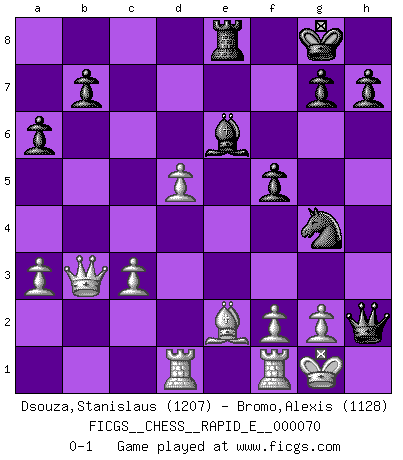 Last move : 0-1 2011 December 30 13:24:36 [Event "FICGS__CHESS__RAPID_E__000070"] [Site "FICGS"] [Date "2011.12.10"] [Round "1"] [White "Dsouza,Stanislaus"] [Black "Bromo,Alexis"] [Result "0-1"] [WhiteElo "1207"] [BlackElo "1128"] 1.e4 e5 2.Nf3 Nc6 3.d3 Nf6 4.Nc3 Bb4 5.a3 Bxc3+ 6.bxc3 d5 7.exd5 Nxd5 8.Bb2 O-O 9.Be2 f5 10.c4 Nf6 11.Nxe5 Nxe5 12.Bxe5 Re8 13.d4 c6 14.O-O Be6 15.c3 a6 16.Qb3 Rb8 17.Bxb8 Qxb8 18.Rad1 Ng4 19.d5 cxd5 20.cxd5 Qxh2+ 0-1 King's pawn game Kingside Castling by player Black (move 8) Kingside Castling by player White (move 14) Player Black won this chess game. Follow this game move after move (download)I still hope to kill Fischer. (Boris Spassky) Im Spitzenschach von heute geht es nur um Vorbereitung, um tiefgründige, sorgfältige Eröffnungsvorbereitung. (Nigel Short) El Ajedrez es un invernadero donde los frutos del carácter pueden madurar mas completamente que en la vida. (Edward Morgan Foster) Si rien de grave n'est détecté lors de l'analyse d'une position, on joue alors le coup. Seconde règle de Blumenfeld. Have no fear of perfection - you'll never reach it. (Salvador Dali)