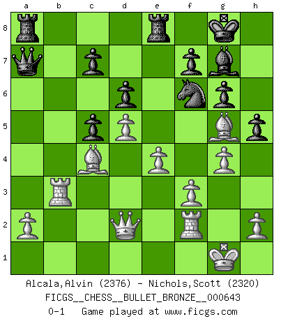 Last move : 0-1 2011 December 10 18:17:25 [Event "FICGS__CHESS__BULLET_BRONZE__000643"] [Site "FICGS"] [Date "2011.12.10"] [Round "1"] [White "Alcala,Alvin"] [Black "Nichols,Scott"] [Result "0-1"] [WhiteElo "2376"] [BlackElo "2320"] 1.Nf3 g6 2.d4 Nf6 3.c4 Bg7 4.Nc3 O-O 5.e4 d6 6.Be2 e5 7.O-O exd4 8.Nxd4 Re8 9.f3 Nc6 10.Be3 Nh5 11.Nxc6 bxc6 12.Qd2 c5 13.Rad1 Bb7 14.Nd5 a5 15.b3 Qb8 16.Bg5 Bxd5 17.cxd5 a4 18.Rb1 axb3 19.Rxb3 Qa7 20.Bb5 Re5 21.Bc4 R5e8 22.g4 Nf6 23.Rf2 h5 0-1 This chess game has been lost on time (started : 2011.12.10 17:55:36) Reti Opening Kingside Castling by player Black (move 4) Kingside Castling by player White (move 7) Player Black won this chess game. Follow this game move after move (download)The only thing Chess players have in common is Chess. (Lodewijk Prins) Ivan Sokolov treibt mich als Beifahrer an mit go Loeky go - . (Loek van Wely) Los problemas de Ajedrez exigen del compositor las mismas virtudes que caracterizan todo el arte de valor: originalidad, invención, concisión, armonía, complejidad e insinceridad explendida. (Vladimir Nabokov) Les Echecs mettent en conflit, non pas deux intelligences, mais deux volontés. (Lasker) Optimism is a variety of information deficit. Sometimes especially true for correspondence chess games. (Michael Aigner)