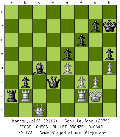 Last move : 1/2-1/2 2011 December 11 9:38:50 [Event "FICGS__CHESS__BULLET_BRONZE__000645"] [Site "FICGS"] [Date "2011.12.11"] [Round "1"] [White "Morrow,Wolff"] [Black "Schutte,John"] [Result "1/2-1/2"] [WhiteElo "2116"] [BlackElo "2279"] 1.d4 d5 2.c4 e6 3.g3 Nf6 4.Nf3 dxc4 5.Bg2 a6 6.O-O Nc6 7.e3 Bd7 8.Qe2 b5 9.b3 cxb3 10.axb3 Bb4 11.Ne1 O-O 12.Nd3 Bd6 13.Bb2 Nd5 14.Nc3 Ndb4 15.Nxb4 Nxb4 16.Bxa8 Qxa8 17.e4 Qb7 18.Rfd1 Re8 19.Rd2 h6 20.Ba3 a5 21.R2d1 Be7 22.Bc1 Ra8 23.Kg2 Bd6 24.Bb2 c5 25.dxc5 Bxc5 26.Rac1 Be7 27.f3 Bc6 28.h4 Qb6 29.Nb1 Bc5 30.Be5 Be8 31.Qb2 Bf8 32.Bd4 Qb7 33.Bc5 Bxc5 34.Rxc5 Kh7 35.Qd2 Bc6 36.Qe3 Rc8 37.Rd6 f6 38.Qf4 Qe7 39.Qd2 e5 40.Rc3 h5 41.Rc1 Qc7 42.Na3 Rb8 43.Nc2 Na2 44.Re1 b4 45.Ne3 Nc3 46.Nf5 Be8 47.Rc1 a4 48.bxa4 Bxa4 49.Ra6 Qd7 50.Qe3 Rb7 51.Rd6 Qc7 52.Kh2 Qc4 53.Rd2 Rc7 54.Qe1 Qa6 55.Rb2 Rd7 56.Ne3 Rd4 57.Kg2 Qd3 58.Qf2 Nd1 59.Nxd1 Bxd1 60.R2b1 Ba4 61.Kg1 b3 62.Rb2 Qb5 63.Rd2 Qb4 64.Rb2 Rd3 65.Kg2 Bd7 66.Rc5 Be6 67.Rc7 Rd4 68.Qe3 Qd6 69.Rc1 Qa6 70.Qe2 Qa3 71.Rcb1 Qd6 72.Ra1 Qd7 73.Rc1 Ra4 74.Qd2 Qb5 75.Rcb1 Qc5 76.Rc1 Qf8 77.Qc3 Ra2 78.Rd2 Qb8 79.Rb1 Qc8 80.Qe3 Bc4 81.Rf2 Qd7 82.Qc1 Qd4 83.R1b2 Be6 84.Rfe2 Qd3 85.Rf2 Kg6 86.Qc6 Bf7 87.Qc1 Kh7 88.Kh3 Bc4 89.Kg2 1/2-1/2 Queen's gambit declined Kingside Castling by player White (move 6) Kingside Castling by player Black (move 11) This chess game ended in a draw. Follow this game move after move (download)There just isn't enough televised Chess. (David Letterman) Der 70jährige Viktor Kortschnoi: Die Rentenanstalt wollte mich zwingen in Rente zu gehen. Meine Frau erhält jetzt eine Pension- und ich zahle weiter in die Rentenkasse ein! (Viktor Kortschnoi) Ayuda a tus piezas para que ellas te puedan ayudar. (Paul Morphy) Le plus grand jeu de l'esprit jamais inventé, plus vous l'apprenez, plus vous y prenez du plaisir. (Garry Kasparov) If you are good, you will be assigned all the work. If you are really good, you will get out of it. (Dan Rotaru)