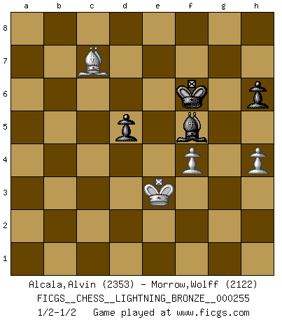 Last move : 1/2-1/2 2011 December 11 19:47:52 [Event "FICGS__CHESS__LIGHTNING_BRONZE__000255"] [Site "FICGS"] [Date "2011.12.11"] [Round "1"] [White "Alcala,Alvin"] [Black "Morrow,Wolff"] [Result "1/2-1/2"] [WhiteElo "2353"] [BlackElo "2122"] 1.g3 d5 2.d4 Nf6 3.Bg2 g6 4.Nf3 c6 5.O-O Bg7 6.c4 dxc4 7.a4 Be6 8.Ng5 Bg4 9.Na3 h6 10.Nf3 Be6 11.Ne5 Nbd7 12.Nexc4 Nb6 13.Ne5 Nbd7 14.Nd3 O-O 15.e4 Qb6 16.Nc2 a5 17.Ra3 Rad8 18.Be3 Qa6 19.f3 Bc4 20.Rf2 c5 21.Rd2 cxd4 22.Bxd4 Nh7 23.Bf2 Nb6 24.Nc5 Qa8 25.Nd3 Qa6 26.Nc5 Qa8 27.b3 Bc3 28.Rxd8 Rxd8 29.Qc1 Be2 30.Ne1 Bxe1 31.Bxe1 Qa7 32.Qe3 Nd7 33.b4 Nxc5 34.bxc5 Ba6 35.Ra1 Ng5 36.Qf2 Bd3 37.Rd1 Ne6 38.Qe3 Qxc5 39.Qxc5 Nxc5 40.Bxa5 Rc8 41.Rc1 Rc6 42.Bb4 Nxa4 43.Rxc6 bxc6 44.Bxe7 f5 45.exf5 Bxf5 46.f4 Bd7 47.Kf2 Nc3 48.Bf6 Nd5 49.Bd4 g5 50.Be5 gxf4 51.gxf4 Kf7 52.Bxd5+ cxd5 53.Ke3 Bf5 54.h4 Kg6 55.Bc7 Kf6 1/2-1/2 Benko's Opening Kingside Castling by player White (move 5) Kingside Castling by player Black (move 14) 10 pieces endgame at move 51 : White KBBPP , Black KBNPP WHITE : King + 2 Bishops 2 Pawns BLACK : King + 1 Bishop 1 Knight 2 Pawns 9 pieces endgame at move 52 : White KBBPP , Black KBPP WHITE : King + 2 Bishops 2 Pawns BLACK : King + 1 Bishop 2 Pawns 8 pieces endgame at move 52 : White KBPP , Black KBPP WHITE : King + 1 Bishop 2 Pawns BLACK : King + 1 Bishop 2 Pawns This chess game ended in a draw. Follow this game move after move (download)Best by test: 1. e4 (Bobby Fischer) Woher wissen wir, daß der Neanderthaler Blindschach gespielt hat? -- Bei Ausgrabungen wurden keine Schachbretter und Figuren gefunden. (Anonymous) Botvinnik trataba de restarle el misterio al Ajedrez, siempre relacionandolo a situaciones de la vida ordinaria. El gustaba de llamar al Ajedrez un típico problema inexacto similar a aquellos de los cuales la gente siempre tiene que enfrentarse en la vida cotidiana. (Garry Kasparov) Mon pion favori sur ma case favorite ! Bronstein en parlant d'un coup de pion en h5 quand il avait les Noirs. We're missing something. (Gregory House, House M.D.)