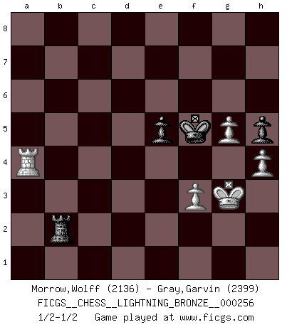 Last move : 1/2-1/2 2011 December 12 5:0:41 [Event "FICGS__CHESS__LIGHTNING_BRONZE__000256"] [Site "FICGS"] [Date "2011.12.12"] [Round "1"] [White "Morrow,Wolff"] [Black "Gray,Garvin"] [Result "1/2-1/2"] [WhiteElo "2136"] [BlackElo "2399"] 1.d4 Nf6 2.c4 e6 3.Nc3 Bb4 4.f3 d5 5.a3 Bxc3+ 6.bxc3 c5 7.cxd5 Nxd5 8.dxc5 Qa5 9.e4 Nf6 10.Be3 O-O 11.Qb3 Nfd7 12.a4 Qc7 13.Qa3 b6 14.a5 bxc5 15.Nh3 Ba6 16.Bxa6 Nxa6 17.Qa4 Rab8 18.O-O c4 19.Nf2 Rb3 20.Rfd1 Nf6 21.Qa2 h5 22.Qd2 Ra8 23.Qd6 Rxc3 24.Qxc7 Nxc7 25.Bd2 Rb3 26.Rac1 Rd8 27.Rxc4 Nb5 28.Rc5 g6 29.e5 Nd5 30.h4 Ndc7 31.Ne4 Na6 32.Rc4 Rbd3 33.Kf2 Kg7 34.Rc2 g5 35.Rb2 R8d5 36.Rdb1 Nc5 37.Bxg5 Nc3 38.Nxc3 Rxc3 39.Bf6+ Kg6 40.Rb8 Nd3+ 41.Kg3 Nxe5 42.Bxe5 Rxe5 43.R1b7 Rxa5 44.Rg8+ Kh7 45.Rf8 Kg6 46.R8xf7 Ra2 47.Kh3 Rc1 48.Rg7+ Kf6 49.Rbf7+ Ke5 50.Rxa7 Rxa7 51.Rxa7 Kf6 52.Ra5 e5 53.g4 Rc3 54.g5+ Kf5 55.Kg3 Rb3 56.Rc5 Ra3 57.Rb5 Rc3 58.Rb4 Ra3 59.Rc4 Rb3 60.Re4 Rb2 61.Ra4 1/2-1/2 Nimzo-Indian : Kmoch variation Kingside Castling by player Black (move 10) Kingside Castling by player White (move 18) 10 pieces endgame at move 50 : White KRPPP , Black KRRPP WHITE : King + 1 Rook 3 Pawns BLACK : King + 2 Rooks 2 Pawns 9 pieces endgame at move 51 : White KRPPP , Black KRPP WHITE : King + 1 Rook 3 Pawns BLACK : King + 1 Rook 2 Pawns This chess game ended in a draw. Follow this game move after move (download)The King is a fighting piece. Use it ! (Wilhelm Steinitz) Es hat in meinem Leben Zeiten gegeben, in denen das Schachspiel, wenn nicht zum Lebenszweck, so doch zu einem regelrechten Lebensersatz geworden ist. Man fühlt sich in solchen Zeiten nicht so, als besäße man eine göttliche Gabe, sondern eher so, als sei man von ihr besessen. (Garry Kasparov) ¡Examina movidas que hagan daño! Un buen ojo for movidas desvastantes es mucho mas importante que el conocimiento de principios estratégicos. (Purdy) Dieu déplace le joueur, et celui-ci la pièce. Quel Dieu derrière Dieu commence donc la trame ? Arturo Perez-Reverte (prix de littérature policière 1993). Life doesn't imitate art, it imitates bad television. (Woody Allen)