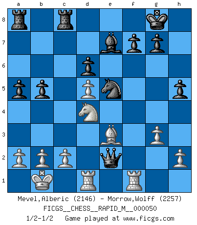 Last move : 1/2-1/2 2012 February 7 22:50:35 [Event "FICGS__CHESS__RAPID_M__000050"] [Site "FICGS"] [Date "2011.12.13"] [Round "1"] [White "Mevel,Alberic"] [Black "Morrow,Wolff"] [Result "1/2-1/2"] [WhiteElo "2146"] [BlackElo "2257"] 1.e4 c5 2.Nf3 d6 3.d4 cxd4 4.Nxd4 Nf6 5.Nc3 a6 6.Be3 e5 7.Nb3 Be6 8.f3 Be7 9.Qd2 h5 10.O-O-O Nbd7 11.Kb1 b5 12.g3 O-O 13.f4 Qc7 14.Nd5 Nxd5 15.exd5 Bf5 16.Bd3 Bg4 17.Be2 Bf5 18.Bd3 Bxd3 19.Qxd3 Rfc8 20.Rhf1 a5 21.fxe5 Nxe5 22.Qe2 Qc4 23.Nd4 Qxe2 1/2-1/2 Sicilian : Najdorf, Byrne (English) attack Queenside Castling by player White (move 10) Kingside Castling by player Black (move 12) This chess game ended in a draw. Follow this game move after move (download)We cannot resist the fascination of sacrifice, since a passion for sacrifices is part of a Chessplayer's nature. (Rudolf Spielman) Schach ist das Spiel, das die Verrückten gesund hält. (Albert Einstein) Las Aperturas te enseñan aperturas. ¡Los Finales te enseñan Ajedrez!. (Stephan Gerzadowicz) À la honte des hommes, on sait que les lois du jeu sont les seules qui soient partout justes, claires, inviolables et exécutées. Pourquoi l'Indien qui a donné les règles du jeu d'échecs est-il obéi de bon gré dans toute la terre, et que les décrétales des papes, par exemple, sont aujourd'hui un objet d'horreur et de mépris ? C'est que l'inventeur des échecs combina tout avec justesse pour la satisfaction des joueurs, et que les papes, dans leurs décrétales, n'eurent en vue que leur seul avantage. L'Indien voulut exercer également l'esprit des hommes et leur donner du plaisir; les papes ont voulu abrutir l'esprit des hommes. Voltaire (Dictionnaire philosophique / Garnier 1967) You think that education is too expensive ? Try ignorance. (Derek Bok)