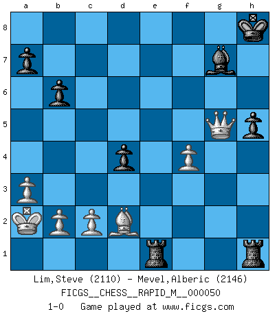 Last move : 1-0 2012 April 7 14:49:26 [Event "FICGS__CHESS__RAPID_M__000050"] [Site "FICGS"] [Date "2011.12.13"] [Round "1"] [White "Lim,Steve"] [Black "Mevel,Alberic"] [Result "1-0"] [WhiteElo "2110"] [BlackElo "2146"] 1.e4 e5 2.Nf3 Nc6 3.Bb5 f5 4.Nc3 fxe4 5.Nxe4 Nf6 6.Qe2 d5 7.Nxf6+ gxf6 8.d4 Bg7 9.dxe5 O-O 10.e6 Ne5 11.Bf4 c6 12.Bd3 Nxd3+ 13.Qxd3 Bxe6 14.Nd4 Re8 15.O-O-O Bd7 16.Kb1 Qe7 17.Bc1 b6 18.h3 Qe4 19.Qb3 Re7 20.g4 Rae8 21.Rhg1 Kh8 22.f3 Qe5 23.f4 Qe4 24.a3 c5 25.Rge1 Qxe1 26.Rxe1 Rxe1 27.Qxd5 Bxg4 28.hxg4 cxd4 29.Qd7 R8e2 30.Ka2 h5 31.Qc8+ Re8 32.Qf5 Rh1 33.g5 fxg5 34.Qxg5 R8e1 35.Bd2 1-0 Ruy Lopez : Schliemann defense, Berger variation Kingside Castling by player Black (move 9) Queenside Castling by player White (move 15) Player White won this chess game. Follow this game move after move (download)In order to improve your game, you must study the endgame before everything else, for whereas the endings can be studied and mastered by themselves, the middle game and the opening must be studied in relation to the endgame. (Jose Raul Capablanca) Sicherlich können nur Meister einen Stil haben. Daß ein nicht-Meister auch nur ein einziges Mal in seinem Leben eine Partie folgerecht durchführte, habe ich niemals bemerkt. (Emanuel Lasker) Bobby Fischer es el mas grande genio de Ajedrez de todos los tiempos. (Alexander Kotov) Mais l'homme est une créature légère et illogique : semblable au joueur d'échecs, il n'aime que le processus du but à atteindre, non le but lui-même. (Dostoïevsky) The ego is not master in its own house. (Sigmund Freud)