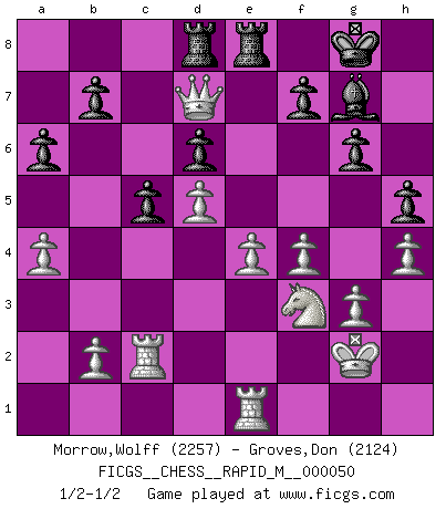 Last move : 1/2-1/2 2011 December 23 7:36:41 [Event "FICGS__CHESS__RAPID_M__000050"] [Site "FICGS"] [Date "2011.12.13"] [Round "1"] [White "Morrow,Wolff"] [Black "Groves,Don"] [Result "1/2-1/2"] [WhiteElo "2257"] [BlackElo "2124"] 1.d4 Nf6 2.c4 e6 3.g3 c5 4.d5 exd5 5.cxd5 d6 6.Nc3 g6 7.Bg2 Bg7 8.Nf3 O-O 9.O-O Re8 10.Bf4 Bf5 11.Qb3 Ne4 12.Nxe4 Bxe4 13.Nd2 Bxg2 14.Kxg2 Nd7 15.e4 Ne5 16.a4 Qc7 17.h4 Rac8 18.Rfc1 Qe7 19.Rc2 h5 20.Re1 Qd7 21.Bxe5 Bxe5 22.f4 Bg7 23.Qb5 Rcd8 24.Nf3 a6 25.Qxd7 1/2-1/2 Catalan Opening Kingside Castling by player Black (move 8) Kingside Castling by player White (move 9) This chess game ended in a draw. Follow this game move after move (download)There are two types of sacrifices: correct ones and mine. (Mikhail Tal) Schach verlangt totale Konzentration. (Robert James Fischer) En un gambito tu regalas un Peón por el bién de tomar un juego perdido. (Samuel Standige Boden) Le jeu d'échecs fait naître et fortifie en nous plusieurs qualités précieuses dans le cours de l'existence, telles que la prévoyance, la circonspection, la prudence, et la persévérance. (Benjamin Franklin - 1783, la morale des échecs) Thus, what is of supreme importance in war is to attack the enemy's strategy. (Sun Tzu)