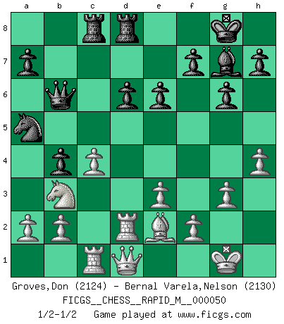 Last move : 1/2-1/2 2012 February 5 22:44:1 [Event "FICGS__CHESS__RAPID_M__000050"] [Site "FICGS"] [Date "2011.12.13"] [Round "1"] [White "Groves,Don"] [Black "Bernal Varela,Nelson"] [Result "1/2-1/2"] [WhiteElo "2124"] [BlackElo "2130"] 1.Nf3 Nf6 2.d4 c5 3.d5 b5 4.Bg5 Qb6 5.e3 Bb7 6.Nc3 b4 7.Bxf6 Qxf6 8.Ne4 Qf5 9.Nxc5 Qxd5 10.Nxb7 Qxb7 11.Be2 Nc6 12.O-O g6 13.c4 Bg7 14.Qd2 O-O 15.Rfd1 Qb6 16.Nd4 Rac8 17.g3 d6 18.Rac1 Bh6 19.Nb3 Rfd8 20.Qe1 Bg7 21.Rd2 Na5 22.Qd1 e6 23.h4 1/2-1/2 Reti Opening Kingside Castling by player White (move 12) Kingside Castling by player Black (move 14) This chess game ended in a draw. Follow this game move after move (download)A player surprised is half beaten. (Proverb) Vom Schach wurde gesagt das Leben sei dafür nicht lange genug. Aber das ist der Fehler des Lebens, nicht des Schach'. (Irving Chernev) Botvinnik trataba de restarle el misterio al Ajedrez, siempre relacionandolo a situaciones de la vida ordinaria. El gustaba de llamar al Ajedrez un típico problema inexacto similar a aquellos de los cuales la gente siempre tiene que enfrentarse en la vida cotidiana. (Garry Kasparov) J'ai vu le vaincu d'Echecs jouer des années durant dans l'espoir de la fête de la victoire. Car tu es plus riche de ce qu'elle existe si même elle n'est point pour toi. Ainsi de la perle du fond des mers. (Antoine de Saint-Exupéry) Imagination is more important than knowledge. Knowledge is limited. Imagination encircles the world. (Albert Einstein)